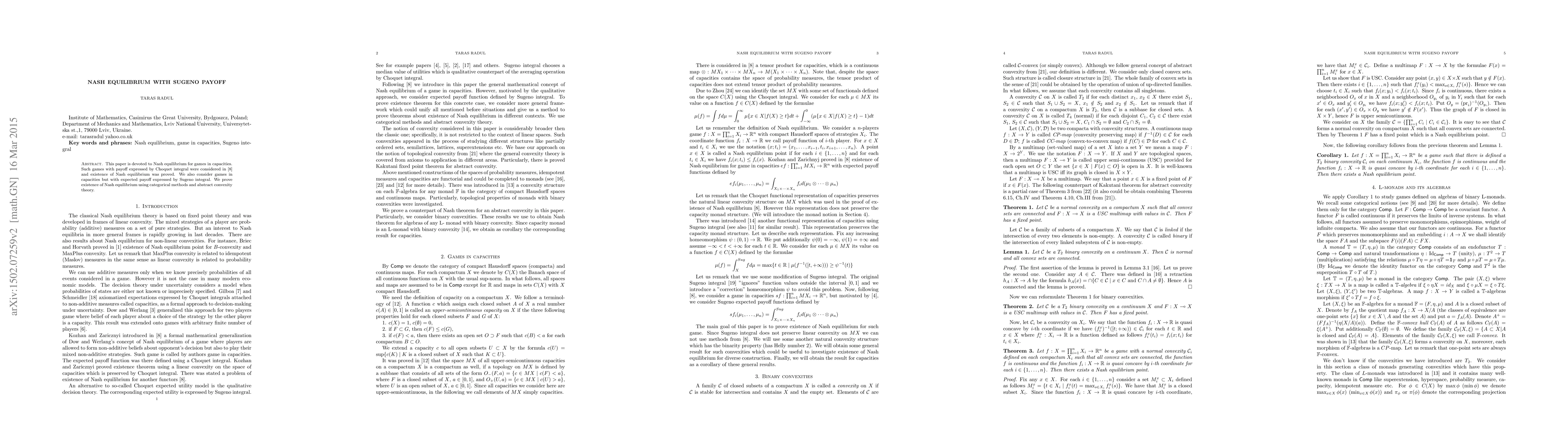 This paper explores Nash equilibrium in games with capacities where payoffs are expressed using the Sugeno integral. It proves the existence of Nash equilibrium through categorical methods and abstract convexity theory.