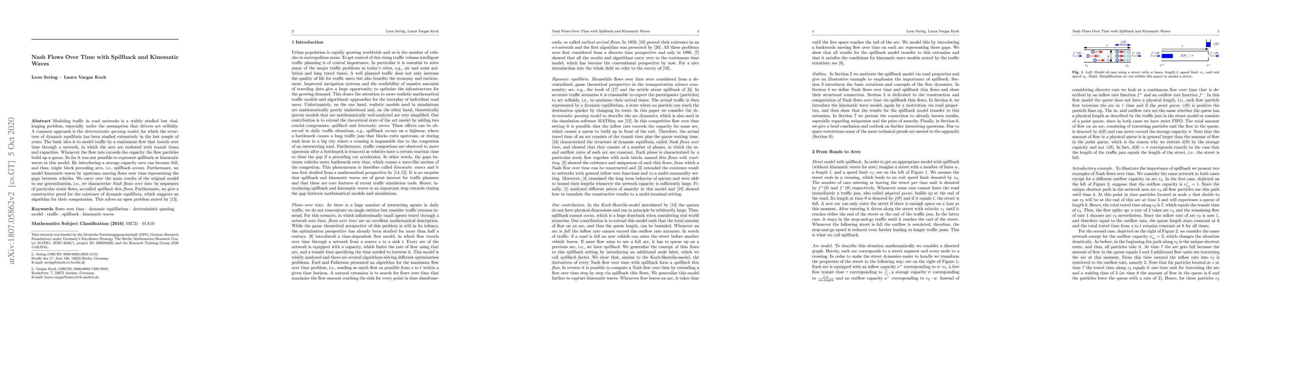 This paper extends the deterministic queuing model to include spillback and kinematic waves, allowing arcs to block preceding arcs when full and modeling upstream moving flows representing vehicle gaps. It characterizes Nash flows over time with spillback thin flows and provides a constructive proof for the existence of dynamic equilibria, solving an open problem.