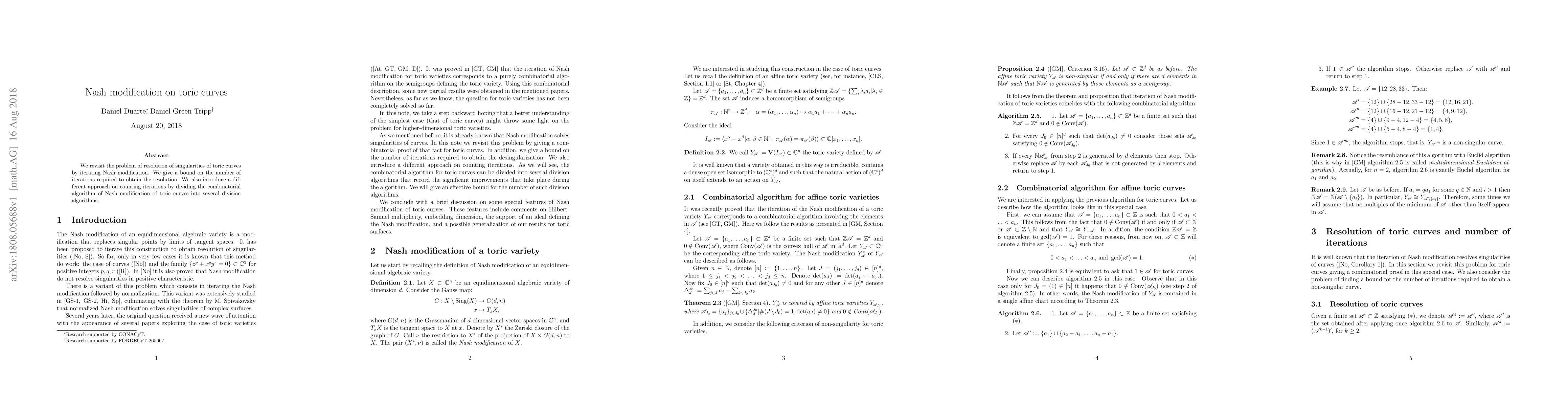 We revisit the problem of resolution of singularities of toric curves by iterating Nash modification. We give a bound on the number of iterations required to obtain the resolution. We also introduce a different approach on counting iterations by dividing the combinatorial algorithm of Nash modification of toric curves into several division algorithms.