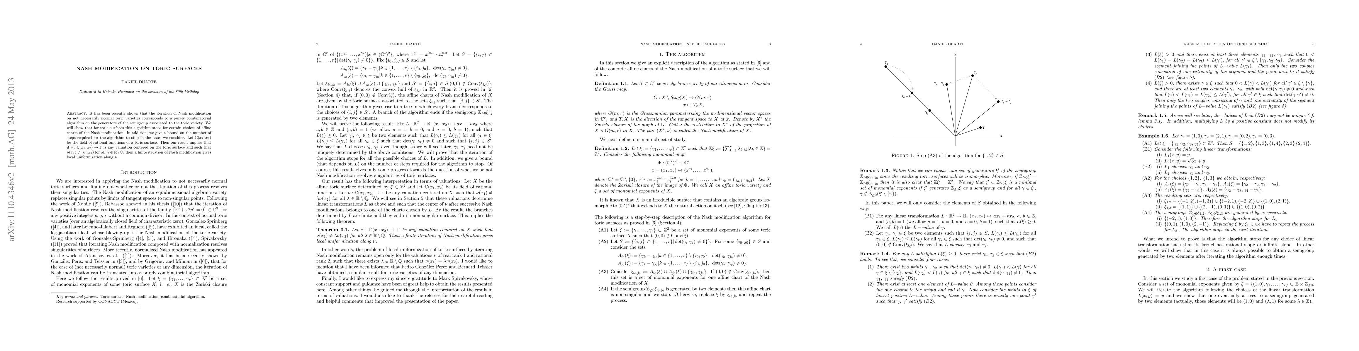 This paper shows that a finite iteration of Nash modification on toric surfaces leads to local uniformization along certain valuations, providing a purely combinatorial solution with a bound on the number of steps required.