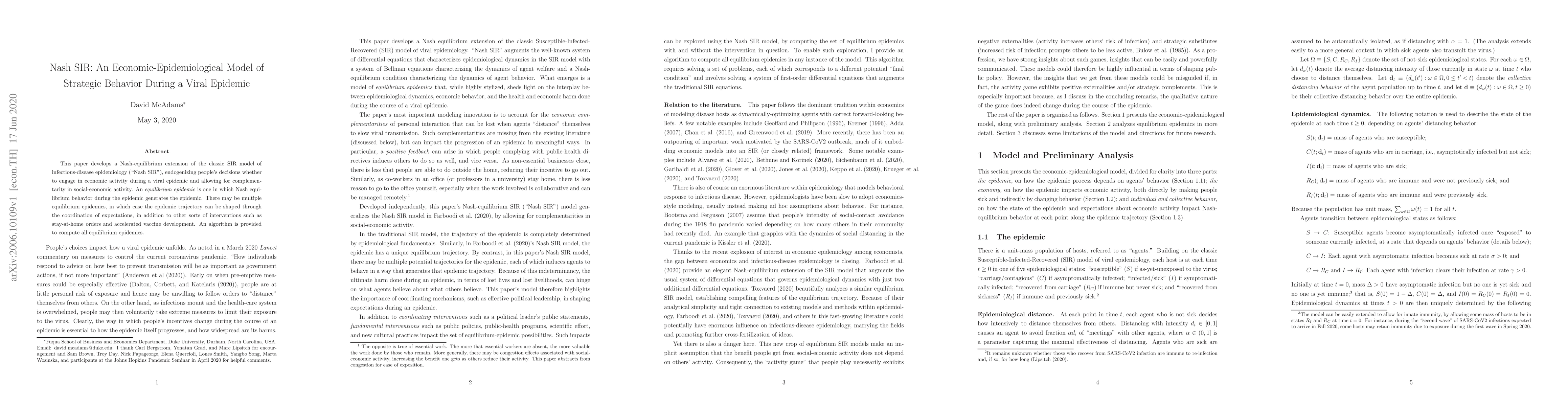 This paper introduces a Nash-equilibrium extension of the SIR model to incorporate strategic economic behavior during a viral epidemic, allowing for multiple equilibrium epidemics shaped by coordinated expectations and interventions. An algorithm is provided to compute these equilibria.