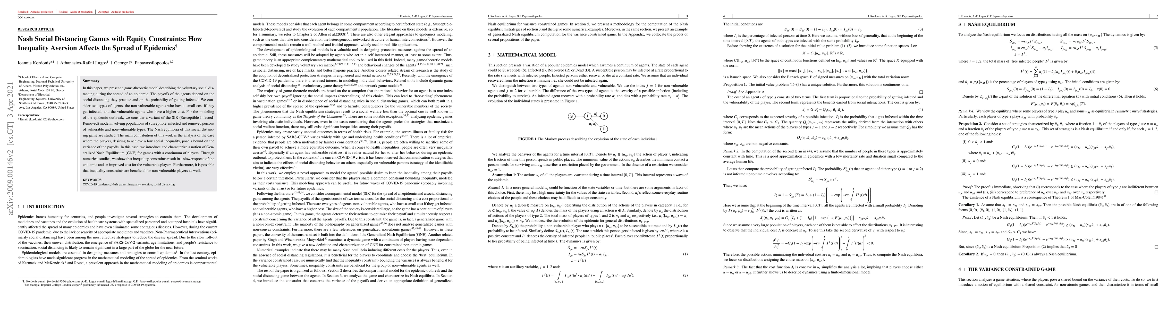 In this paper, we present a game-theoretic model describing voluntary social distancing during the spread of an epidemic. The payoffs of the agents depend on the social distancing they practice and on the probability of getting infected. We consider two types of agents, the non-vulnerable agents who have a small cost if they get infected, and the vulnerable agents who have a higher cost. For the modeling of the epidemic outbreak, we consider a variant of the SIR (Susceptible-Infected-Removed) model involving populations of susceptible, infected, and removed persons of vulnerable and non-vulnerable types. The Nash equilibria of this social distancing game are studied. The main contribution of this work is the analysis of the case where the players, desiring to achieve a low social inequality, pose a bound on the variance of the payoffs. In this case, we introduce and characterize a notion of Generalized Nash Equilibrium (GNE) for games with a continuum of players. Through numerical studies, we show that inequality constraints result in a slower spread of the epidemic and an improved cost for the vulnerable players. Furthermore, it is possible that inequality constraints are beneficial for non-vulnerable players as well.