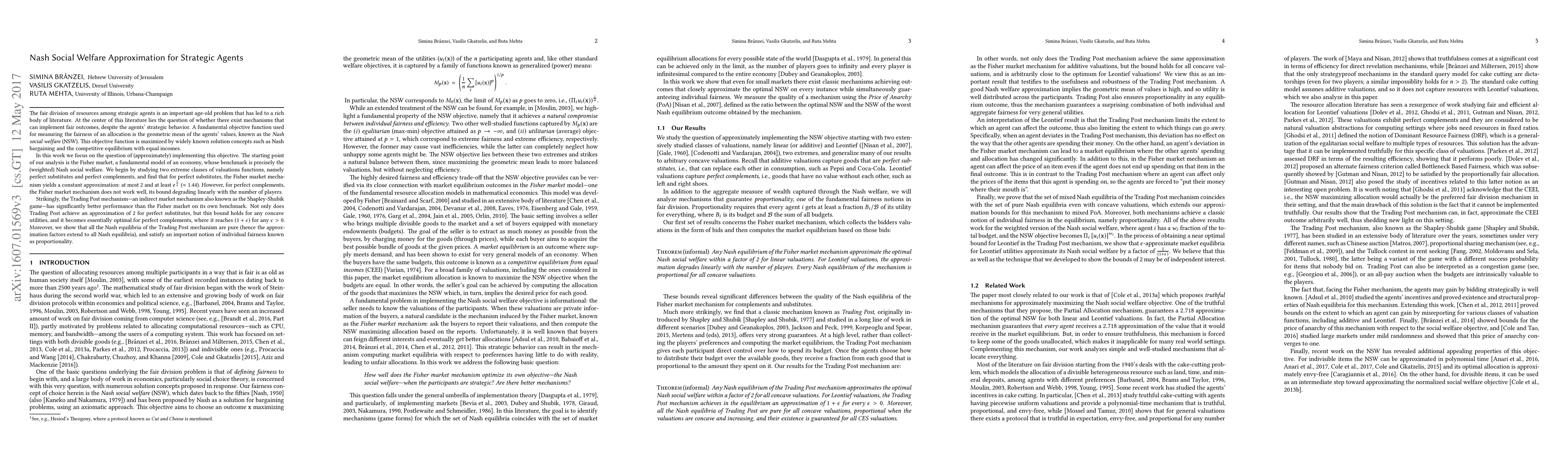 This paper investigates the approximation of Nash social welfare in fair resource division amidst strategic agents. It finds that the Fisher market mechanism provides a constant approximation for perfect substitutes but degrades for perfect complements. In contrast, the Trading Post mechanism achieves a 2-approximation for perfect substitutes and near-optimal performance for Leontief utilities, while also ensuring proportionality and pure Nash equilibria for concave utilities.