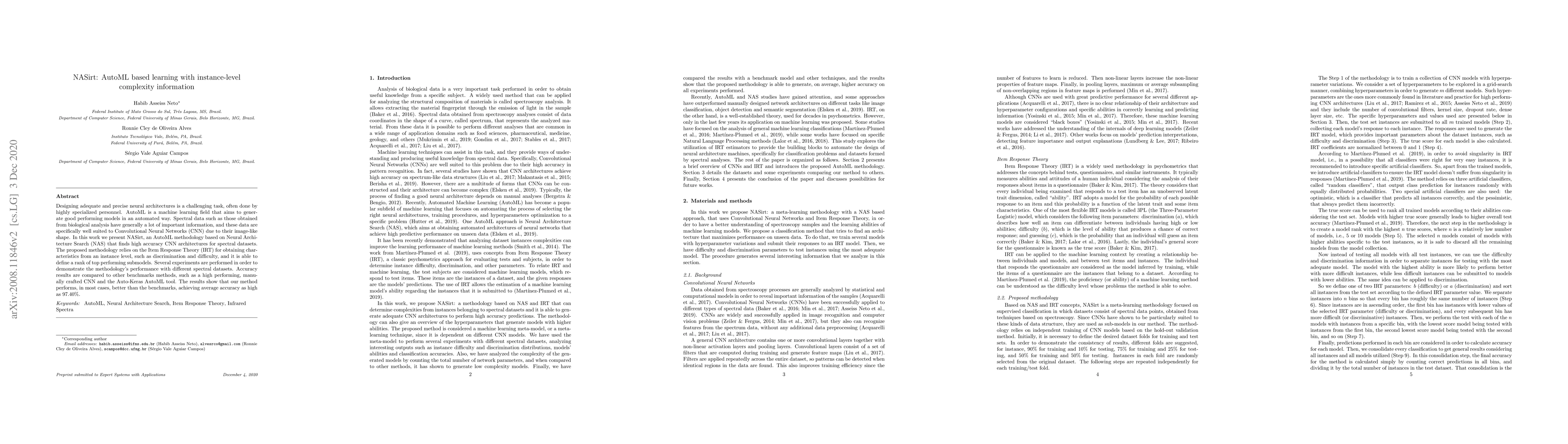 Designing adequate and precise neural architectures is a challenging task, often done by highly specialized personnel. AutoML is a machine learning field that aims to generate good performing models in an automated way. Spectral data such as those obtained from biological analysis have generally a lot of important information, and these data are specifically well suited to Convolutional Neural Networks (CNN) due to their image-like shape. In this work we present NASirt, an AutoML methodology based on Neural Architecture Search (NAS) that finds high accuracy CNN architectures for spectral datasets. The proposed methodology relies on the Item Response Theory (IRT) for obtaining characteristics from an instance level, such as discrimination and difficulty, and it is able to define a rank of top performing submodels. Several experiments are performed in order to demonstrate the methodology's performance with different spectral datasets. Accuracy results are compared to other benchmarks methods, such as a high performing, manually crafted CNN and the Auto-Keras AutoML tool. The results show that our method performs, in most cases, better than the benchmarks, achieving average accuracy as high as 97.40%.