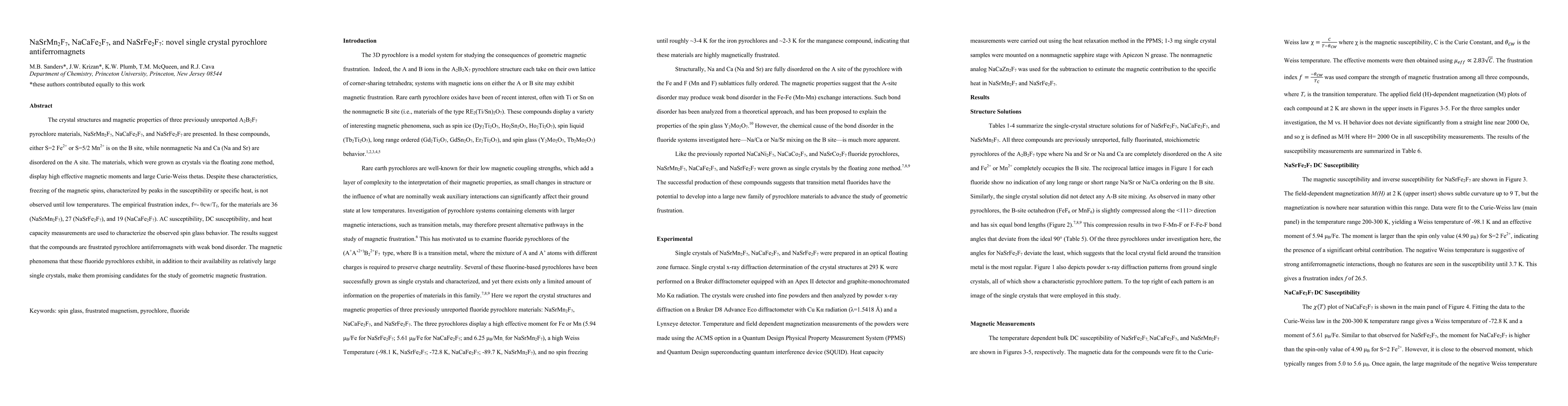 The crystal structures and magnetic properties of three previously unreported A2B2F7 pyrochlore materials, NaSrMn2F7, NaCaFe2F7, and NaSrFe2F7 are presented. In these compounds, either S=2 Fe2+ or S=5/2 Mn2+ is on the B site, while nonmagnetic Na and Ca (Na and Sr) are disordered on the A site. The materials, which were grown as crystals via the floating zone method, display high effective magnetic moments and large Curie-Weiss thetas. Despite these characteristics, freezing of the magnetic spins, characterized by peaks in the susceptibility or specific heat, is not observed until low temperatures. The empirical frustration index, f=- {\theta}cw/Tf, for the materials are 36 (NaSrMn2F7), 27 (NaSrFe2F7), and 19 (NaCaFe2F7). AC susceptibility, DC susceptibility, and heat capacity measurements are used to characterize the observed spin glass behavior. The results suggest that the compounds are frustrated pyrochlore antiferromagnets with weak bond disorder. The magnetic phenomena that these fluoride pyrochlores exhibit, in addition to their availability as relatively large single crystals, make them promising candidates for the study of geometric magnetic frustration.