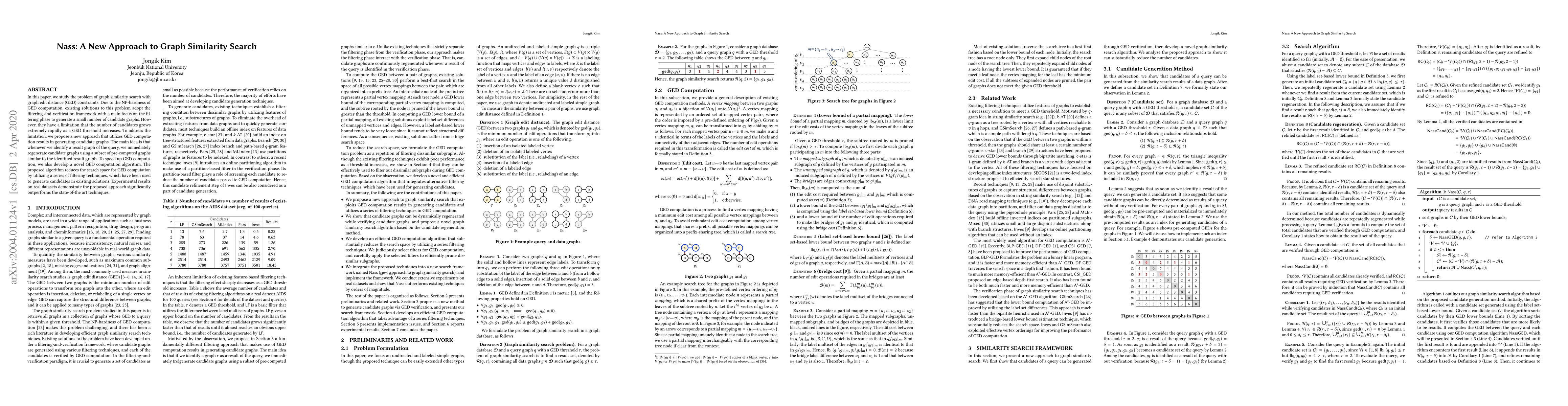 This paper proposes a new approach to graph similarity search that improves upon existing methods by utilizing pre-computed graphs to generate candidate results and developing a novel algorithm for computing graph edit distance.