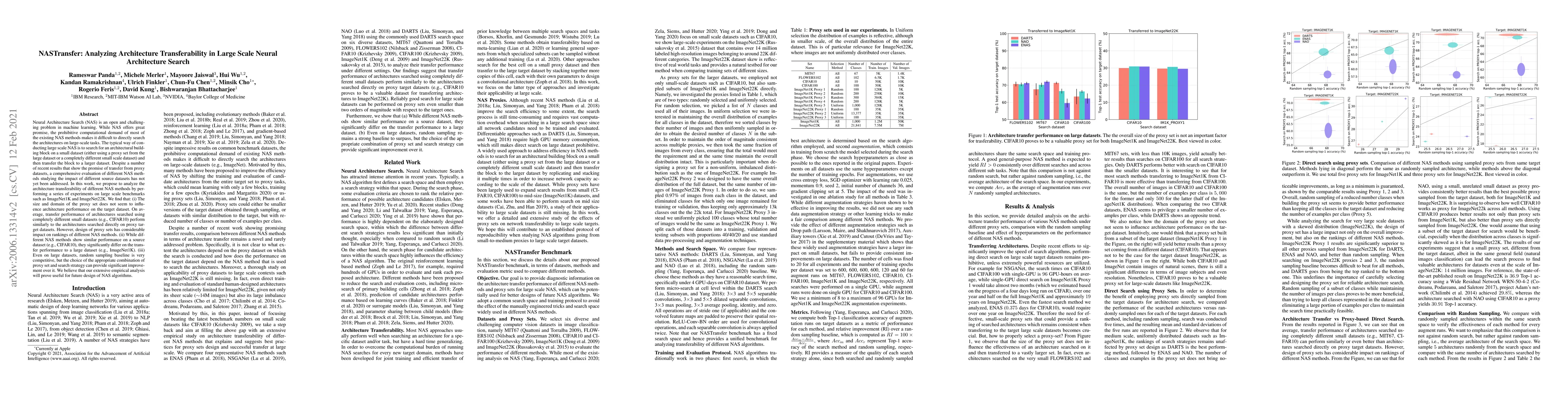Neural Architecture Search (NAS) is an open and challenging problem in machine learning. While NAS offers great promise, the prohibitive computational demand of most of the existing NAS methods makes it difficult to directly search the architectures on large-scale tasks. The typical way of conducting large scale NAS is to search for an architectural building block on a small dataset (either using a proxy set from the large dataset or a completely different small scale dataset) and then transfer the block to a larger dataset. Despite a number of recent results that show the promise of transfer from proxy datasets, a comprehensive evaluation of different NAS methods studying the impact of different source datasets has not yet been addressed. In this work, we propose to analyze the architecture transferability of different NAS methods by performing a series of experiments on large scale benchmarks such as ImageNet1K and ImageNet22K. We find that: (i) The size and domain of the proxy set does not seem to influence architecture performance on the target dataset. On average, transfer performance of architectures searched using completely different small datasets (e.g., CIFAR10) perform similarly to the architectures searched directly on proxy target datasets. However, design of proxy sets has considerable impact on rankings of different NAS methods. (ii) While different NAS methods show similar performance on a source dataset (e.g., CIFAR10), they significantly differ on the transfer performance to a large dataset (e.g., ImageNet1K). (iii) Even on large datasets, random sampling baseline is very competitive, but the choice of the appropriate combination of proxy set and search strategy can provide significant improvement over it. We believe that our extensive empirical analysis will prove useful for future design of NAS algorithms.