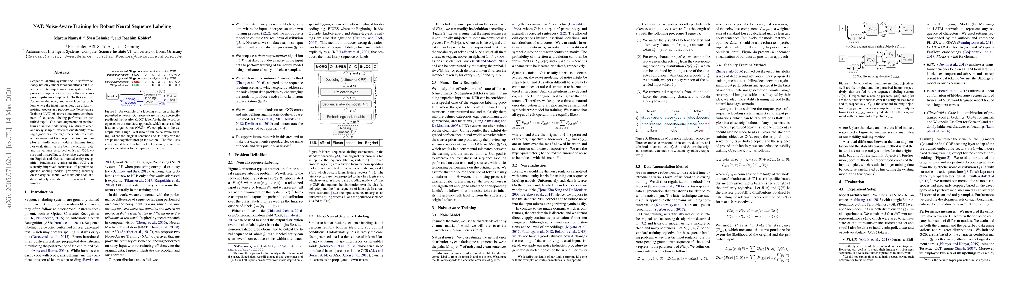 This paper proposes Noise-Aware Training (NAT) methods to enhance the robustness of neural sequence labeling models against corrupted inputs. NAT employs data augmentation and stability training to create noise-invariant latent representations, improving model performance on real OCR errors and misspellings. Experiments show consistent robustness gains on named entity recognition tasks in English and German.