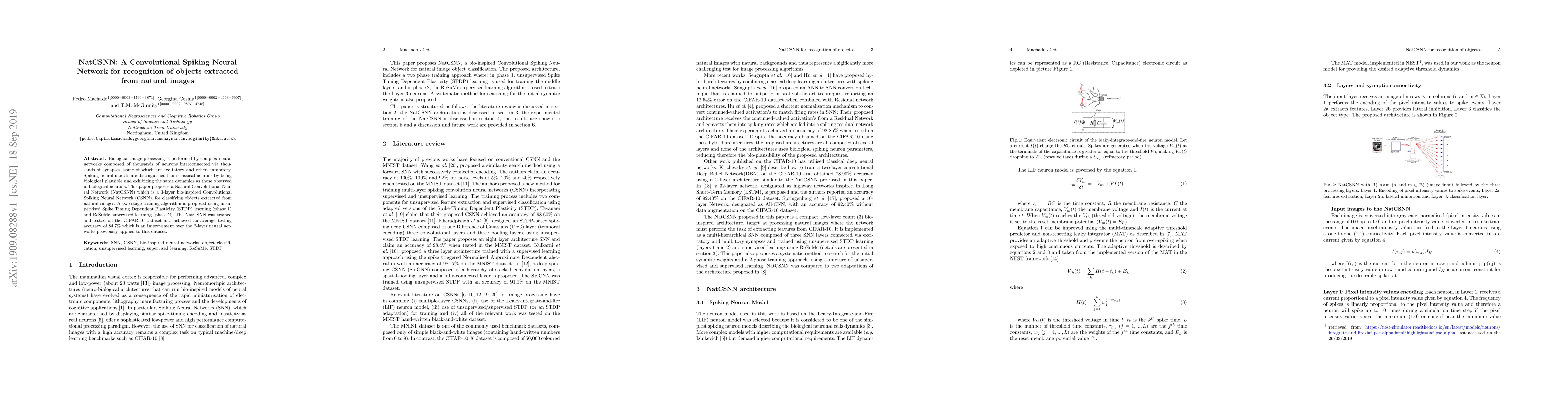 Biological image processing is performed by complex neural networks composed of thousands of neurons interconnected via thousands of synapses, some of which are excitatory and others inhibitory. Spiking neural models are distinguished from classical neurons by being biological plausible and exhibiting the same dynamics as those observed in biological neurons. This paper proposes a Natural Convolutional Neural Network (NatCSNN) which is a 3-layer bio-inspired Convolutional Spiking Neural Network (CSNN), for classifying objects extracted from natural images. A two-stage training algorithm is proposed using unsupervised Spike Timing Dependent Plasticity (STDP) learning (phase 1) and ReSuMe supervised learning (phase 2). The NatCSNN was trained and tested on the CIFAR-10 dataset and achieved an average testing accuracy of 84.7% which is an improvement over the 2-layer neural networks previously applied to this dataset.