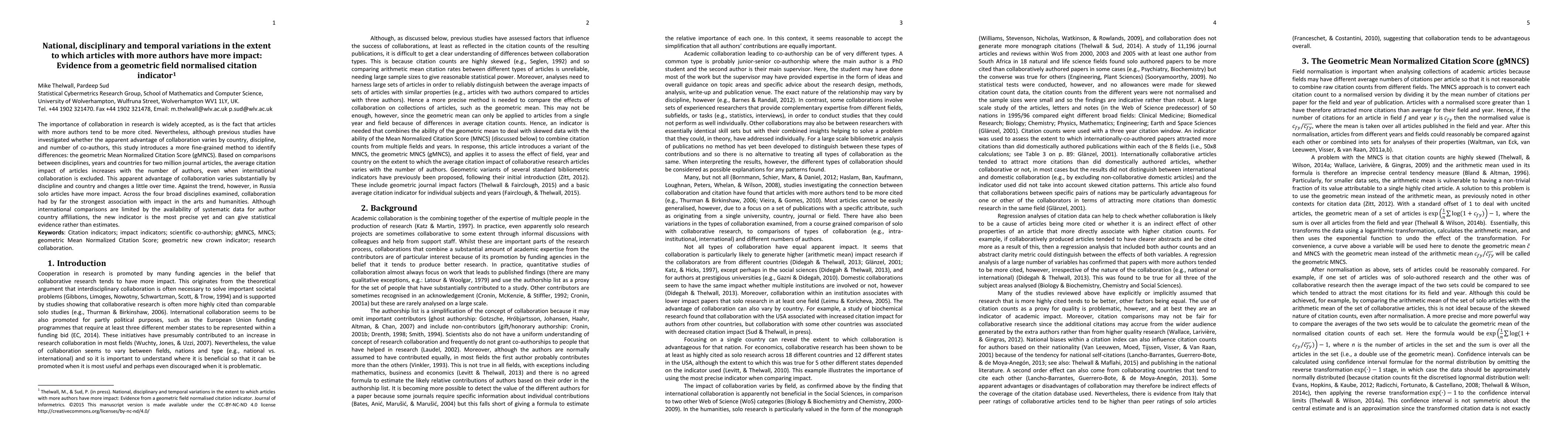 This study examines how the number of authors correlates with article citation impact across different disciplines, countries, and time periods using a new geometric Mean Normalized Citation Score (gMNCS). It finds that articles with more authors generally have higher citation impact, with notable variations by discipline and country, and minimal change over time.