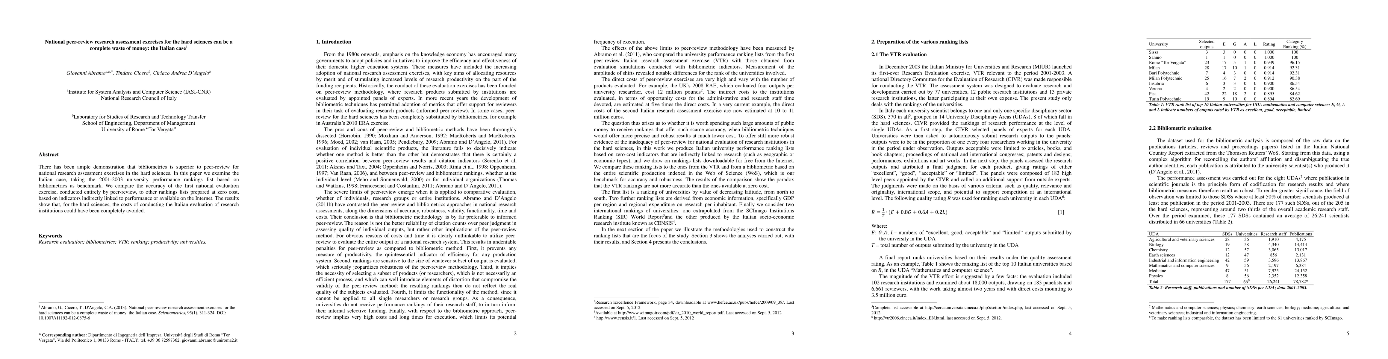 This paper argues that national peer-review research assessments in the hard sciences, exemplified by Italy's 2001-2003 exercise, are inefficient and costly compared to bibliometrics. The study finds that peer-review evaluations are inaccurate and could be replaced by free, bibliometrics-based rankings.