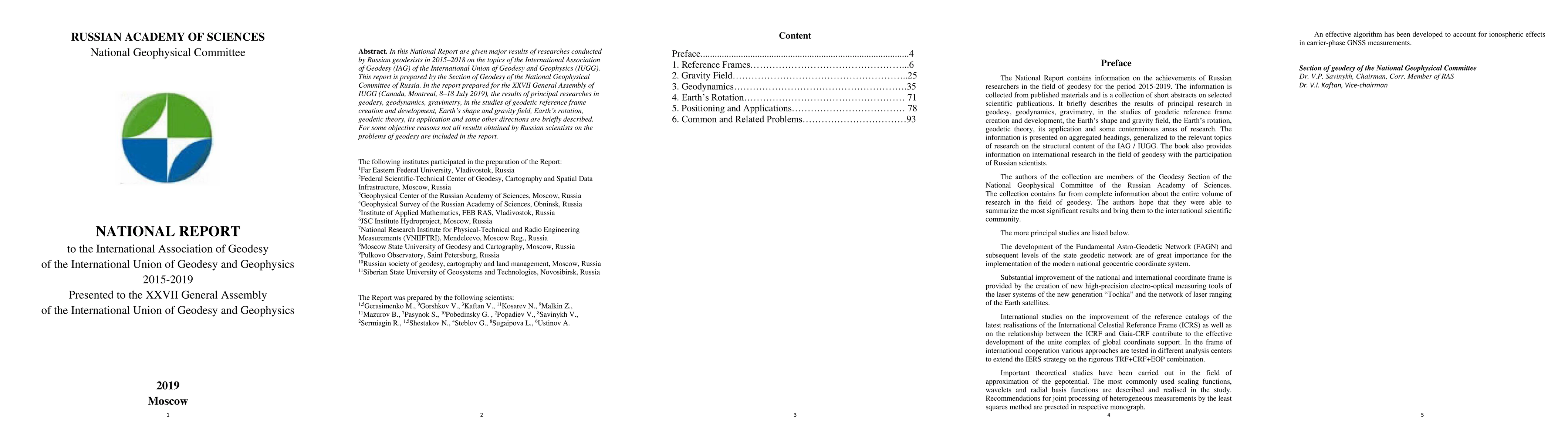 In this National Report are given major results of researches conducted by Russian geodesists in 2015-2018 on the topics of the International Association of Geodesy (IAG) of the International Union of Geodesy and Geophysics (IUGG). This report is prepared by the Section of Geodesy of the National Geophysical Committee of Russia. In the report prepared for the XXVII General Assembly of IUGG (Canada, Montreal, 8-18 July 2019), the results of principal researches in geodesy, geodynamics, gravimetry, in the studies of geodetic reference frame creation and development, Earth's shape and gravity field, Earth's rotation, geodetic theory, its application and some other directions are briefly described. For some objective reasons not all results obtained by Russian scientists on the problems of geodesy are included in the report.