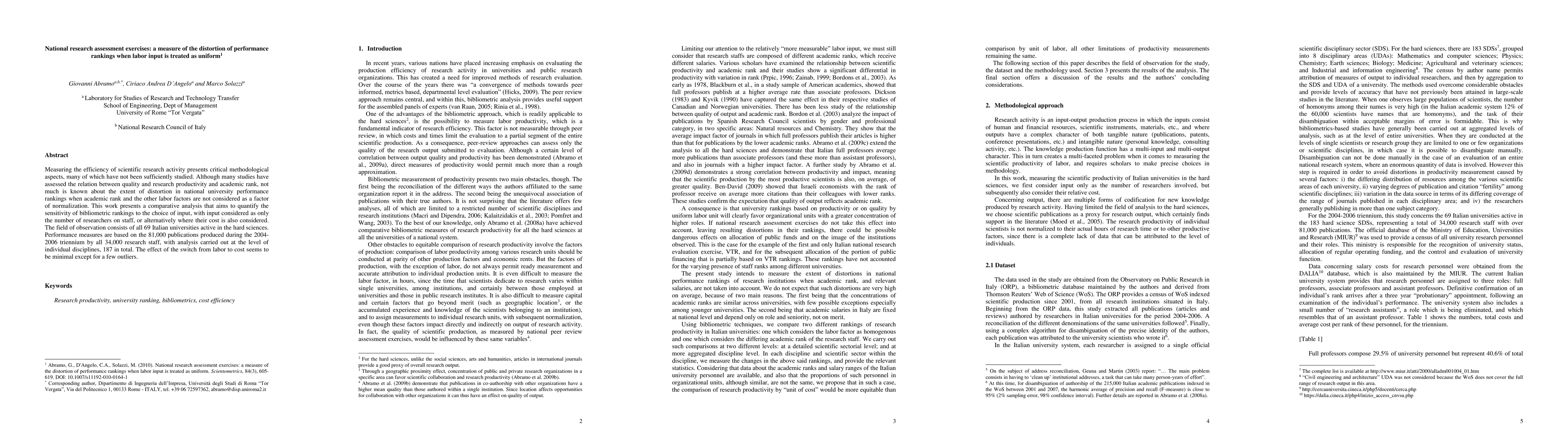 Measuring the efficiency of scientific research activity presents critical methodological aspects, many of which have not been sufficiently studied. Although many studies have assessed the relation between quality and research productivity and academic rank, not much is known about the extent of distortion in national university performance rankings when academic rank and the other labor factors are not considered as a factor of normalization. This work presents a comparative analysis that aims to quantify the sensitivity of bibliometric rankings to the choice of input, with input considered as only the number of researchers on staff, or alternatively where their cost is also considered. The field of observation consists of all 69 Italian universities active in the hard sciences. Performance measures are based on the 81,000 publications produced during the 2004-2006 triennium by all 34,000 research staff, with analysis carried out at the level of individual disciplines, 187 in total. The effect of the switch from labor to cost seems to be minimal except for a few outliers.