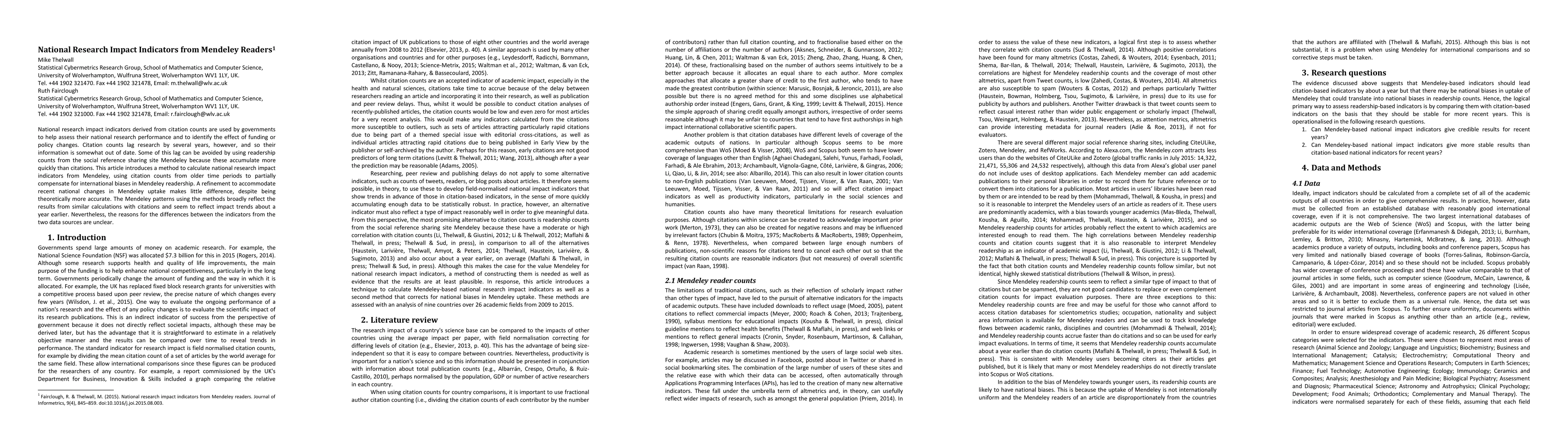This paper proposes a method to derive national research impact indicators from Mendeley readership counts, which update faster than traditional citation counts, to provide more timely assessments of research performance. While Mendeley indicators reflect similar trends to citation-based metrics, the reasons for differences remain unclear.