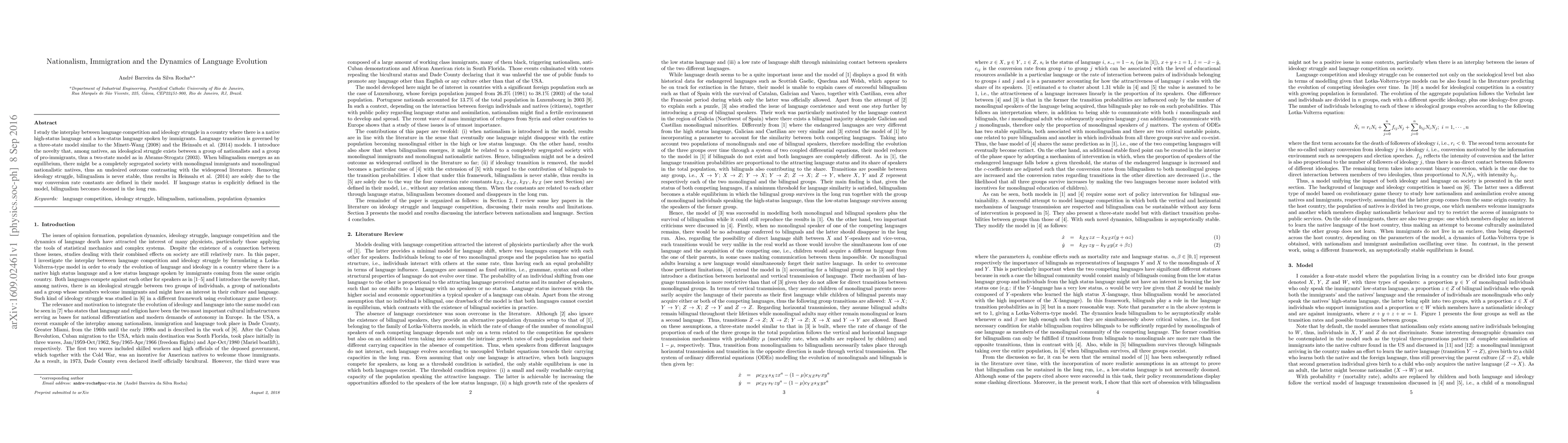 I study the interplay between language competition and ideology struggle in a country where there is a native high-status language and a low-status language spoken by immigrants. Language transition is governed by a three-state model similar to the Minett-Wang (2008) and the Heinsalu et al. (2014) models. I introduce the novelty that, among natives, an ideological struggle exists between a group of nationalists and a group of pro-immigrants, thus a two-state model as in Abrams-Strogatz (2003). When bilingualism emerges as an equilibrium, there might be a completely segregated society with monolingual immigrants and monolingual nationalistic natives, thus an undesired outcome contrasting with the widespread literature. Removing ideology struggle, bilingualism is never stable, thus results in Heinsalu et al. (2014) are solely due to the way conversion rate constants are defined in their model. If language status is explicitly defined in the model, bilingualism becomes doomed in the long run.