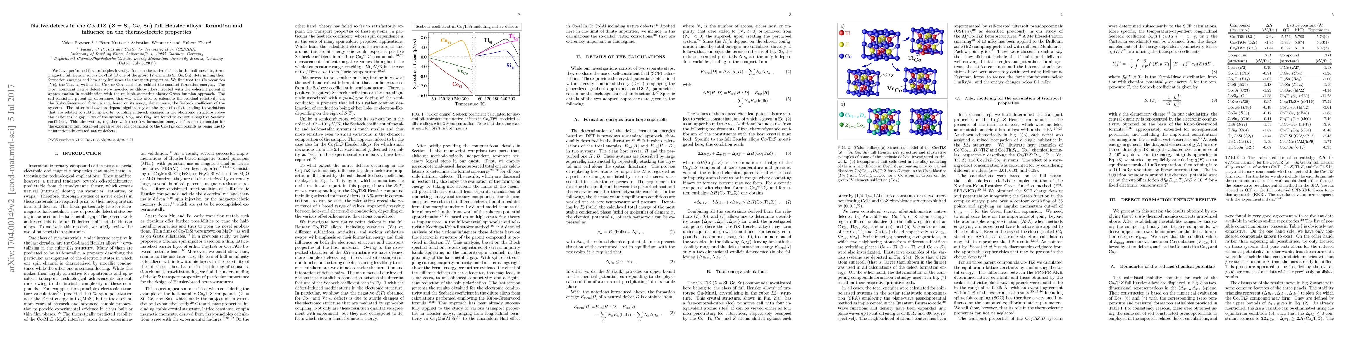 We have performed first-principles investigations on the native defects in the full Heusler alloys Co$_2$Ti$Z$ ($Z$ one of the group IV elements Si, Ge, Sn), determining their formation energies and how they influence the transport properties. We find that Co vacancies (Vc) in all compounds and the Ti$_\text{Sn}$ anti-site exhibit negative formation energies. The smallest positive values occur for Co in excess on anti-sites (Co$_Z$ or Co$_\text{Ti}$) and for Ti$_Z$. The most abundant native defects were modeled as dilute alloys, treated with the coherent potential approximation in combination with the multiple-scattering theory Green function approach. The self-consistent potentials determined this way were used to calculate the residual resistivity via the Kubo-Greenwood formula and, based on its energy dependence, the Seebeck coefficient of the systems. The latter is shown to depend significantly on the type of defect, leading to variations that are related to subtle, spin-orbit coupling induced, changes in the electronic structure above the half-metallic gap. Two of the systems, Vc$_\text{Co}$ and Co$_Z$, are found to exhibit a negative Seebeck coefficient. This observation, together with their low formation energy, offers an explanation for the experimentally observed negative Seebeck coefficient of the Co$_2$Ti$Z$ compounds as being due to unintentionally created native defects.