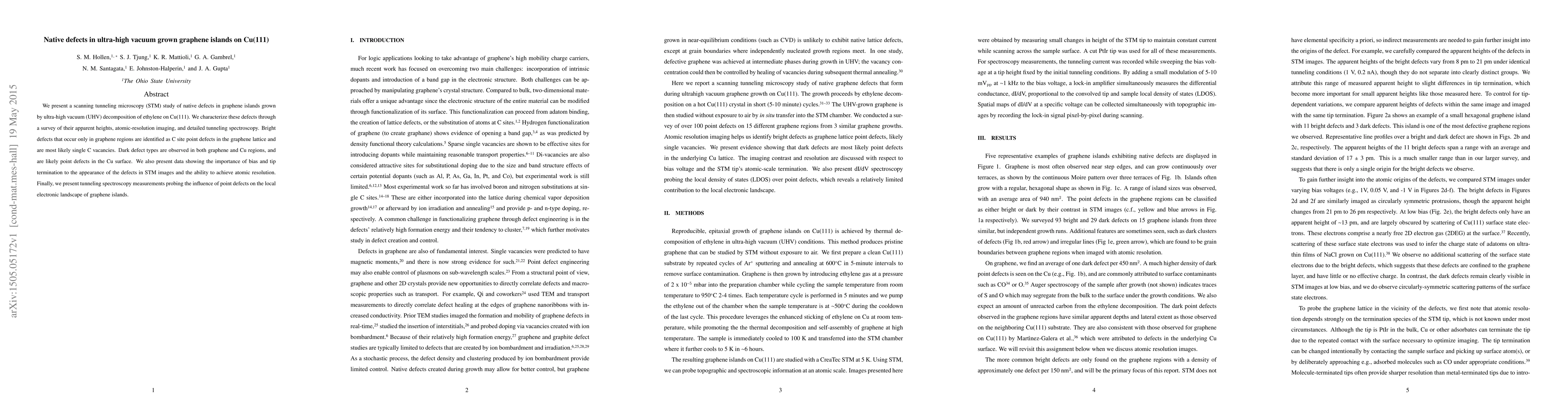 This study uses scanning tunneling microscopy to investigate native defects in graphene islands grown on Cu(111) via UHV decomposition of ethylene, identifying C site point defects as bright spots and Cu surface point defects as dark spots. The research highlights the effect of bias and tip termination on defect visibility and atomic resolution.