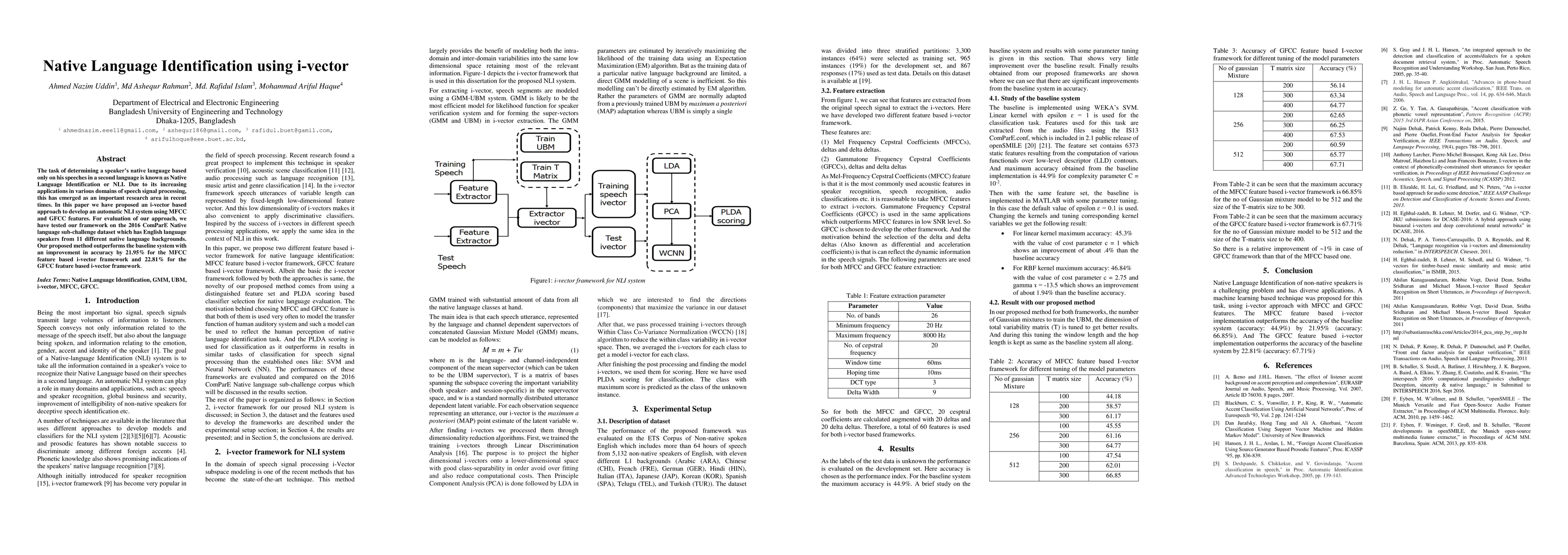 This paper proposes an i-vector based approach for automatic Native Language Identification (NLI) using MFCC and GFCC features. The method outperforms baselines by achieving 21.95% and 22.81% accuracy improvements on the ComParE dataset for MFCC and GFCC respectively.