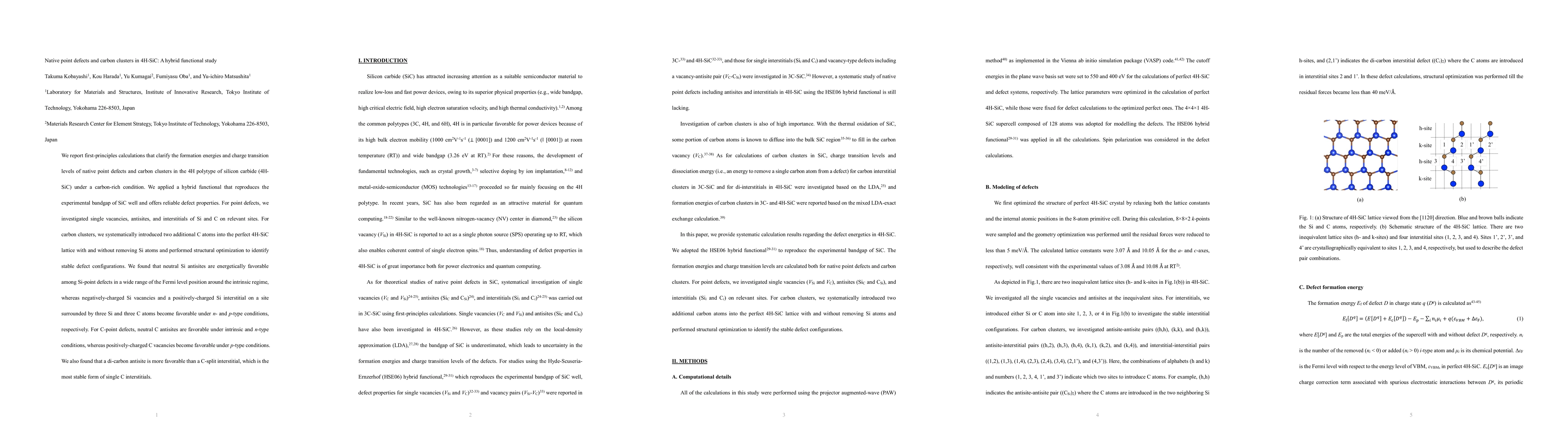 This study uses hybrid functional calculations to determine the formation energies and charge states of native point defects and carbon clusters in 4H-SiC under carbon-rich conditions. It finds that neutral Si antisites are most favorable, while negatively-charged Si vacancies and positively-charged Si interstitials are favorable under n- and p-type doping, respectively.