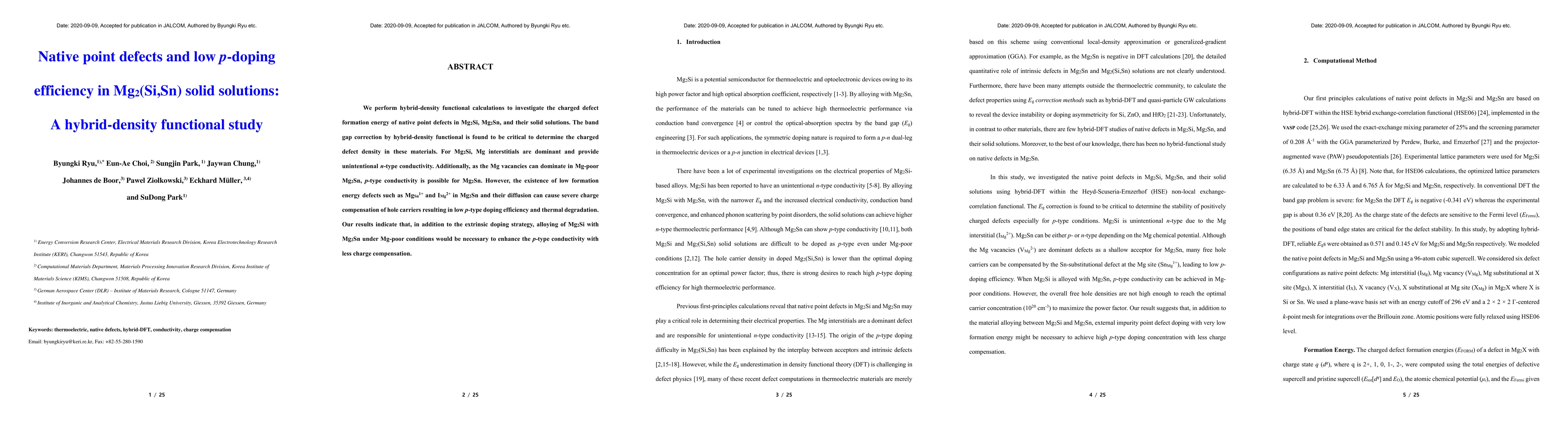 Research on $Mg_2 (Si,Sn)$ solid solutions finds that native point defects and low $p$-doping efficiency occur due to charge compensation from defects like $Mg_{Sn}^{1+}$ and $I_{Mg}^{2+}$.