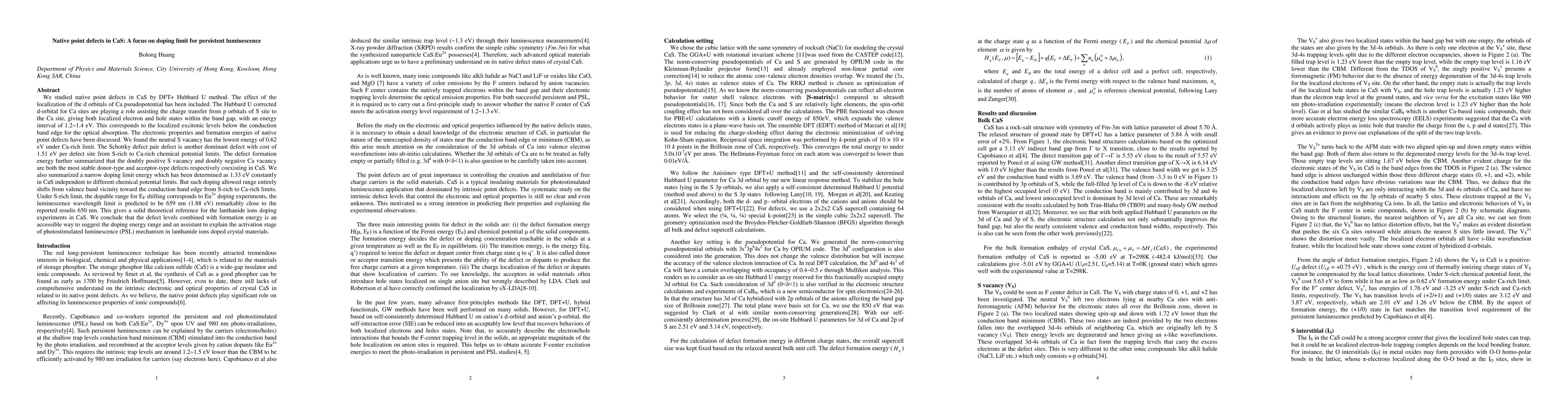 Researchers investigated native point defects in CaS using DFT+ Hubbard U method, finding a doping limit for persistent luminescence at 1.33 eV with implications for lanthanide ions doping experiments.