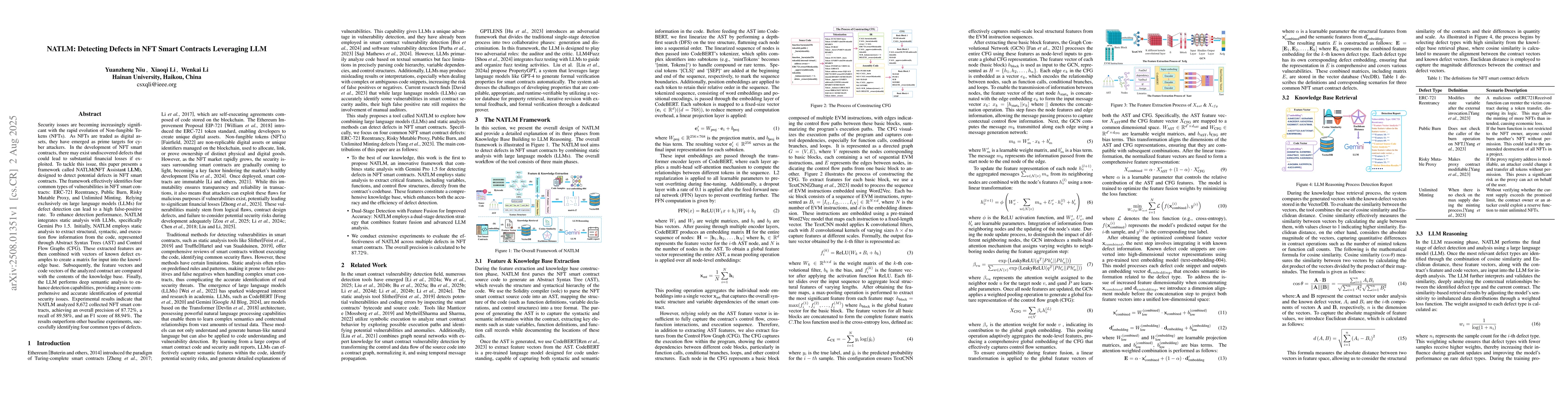 Security issues are becoming increasingly significant with the rapid evolution of Non-fungible Tokens (NFTs). As NFTs are traded as digital assets, they have emerged as prime targets for cyber attackers. In the development of NFT smart contracts, there may exist undiscovered defects that could lead to substantial financial losses if exploited. To tackle this issue, this paper presents a framework called NATLM(NFT Assistant LLM), designed to detect potential defects in NFT smart contracts. The framework effectively identifies four common types of vulnerabilities in NFT smart contracts: ERC-721 Reentrancy, Public Burn, Risky Mutable Proxy, and Unlimited Minting. Relying exclusively on large language models (LLMs) for defect detection can lead to a high false-positive rate. To enhance detection performance, NATLM integrates static analysis with LLMs, specifically Gemini Pro 1.5. Initially, NATLM employs static analysis to extract structural, syntactic, and execution flow information from the code, represented through Abstract Syntax Trees (AST) and Control Flow Graphs (CFG). These extracted features are then combined with vectors of known defect examples to create a matrix for input into the knowledge base. Subsequently, the feature vectors and code vectors of the analyzed contract are compared with the contents of the knowledge base. Finally, the LLM performs deep semantic analysis to enhance detection capabilities, providing a more comprehensive and accurate identification of potential security issues. Experimental results indicate that NATLM analyzed 8,672 collected NFT smart contracts, achieving an overall precision of 87.72%, a recall of 89.58%, and an F1 score of 88.94%. The results outperform other baseline experiments, successfully identifying four common types of defects.