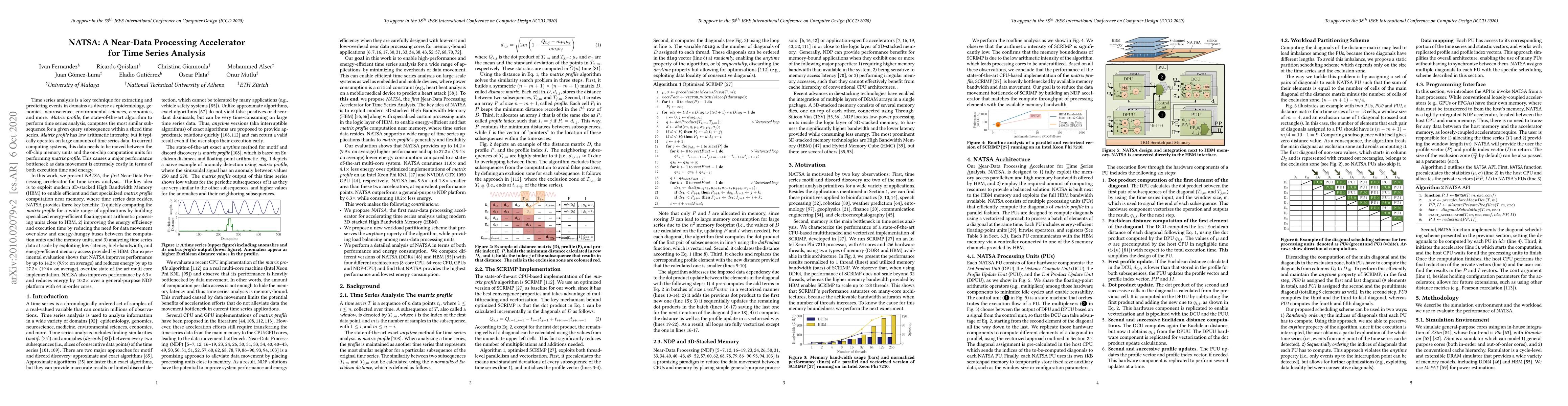 NATSA is a Near-Data Processing accelerator designed to enhance time series analysis by leveraging 3D-stacked High Bandwidth Memory (HBM) for efficient matrix profile computation. It significantly improves performance and energy efficiency by minimizing data movement and utilizing specialized processing units near the memory.