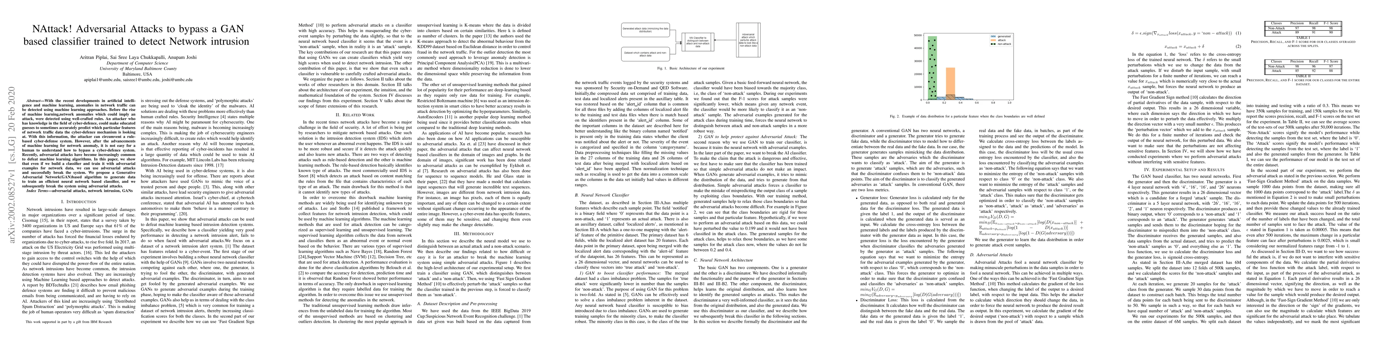 With the recent developments in artificial intelligence and machine learning, anomalies in network traffic can be detected using machine learning approaches. Before the rise of machine learning, network anomalies which could imply an attack, were detected using well-crafted rules. An attacker who has knowledge in the field of cyber-defence could make educated guesses to sometimes accurately predict which particular features of network traffic data the cyber-defence mechanism is looking at. With this information, the attacker can circumvent a rule-based cyber-defense system. However, after the advancements of machine learning for network anomaly, it is not easy for a human to understand how to bypass a cyber-defence system. Recently, adversarial attacks have become increasingly common to defeat machine learning algorithms. In this paper, we show that even if we build a classifier and train it with adversarial examples for network data, we can use adversarial attacks and successfully break the system. We propose a Generative Adversarial Network(GAN)based algorithm to generate data to train an efficient neural network based classifier, and we subsequently break the system using adversarial attacks.