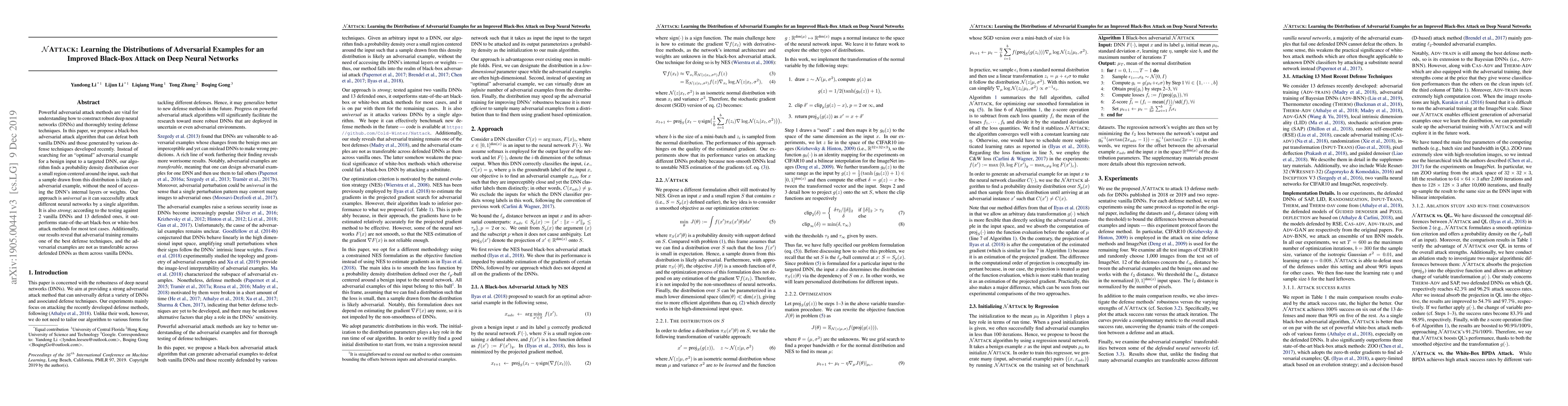 This paper introduces a novel black-box adversarial attack algorithm, NATTACK, which identifies probability distributions of adversarial examples without needing internal DNN information. The method outperforms existing attack techniques and demonstrates that adversarial training is still effective against such attacks.