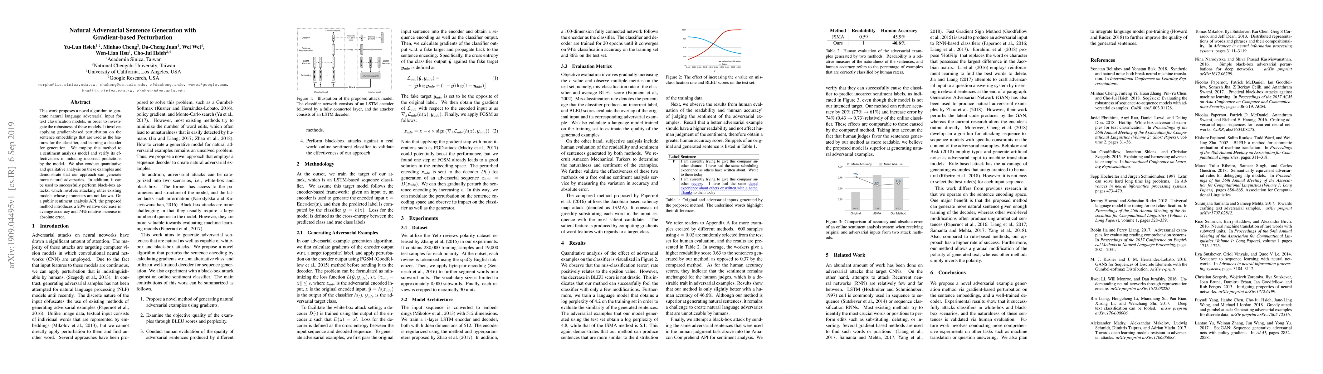 This work proposes a novel algorithm to generate natural language adversarial input for text classification models, in order to investigate the robustness of these models. It involves applying gradient-based perturbation on the sentence embeddings that are used as the features for the classifier, and learning a decoder for generation. We employ this method to a sentiment analysis model and verify its effectiveness in inducing incorrect predictions by the model. We also conduct quantitative and qualitative analysis on these examples and demonstrate that our approach can generate more natural adversaries. In addition, it can be used to successfully perform black-box attacks, which involves attacking other existing models whose parameters are not known. On a public sentiment analysis API, the proposed method introduces a 20% relative decrease in average accuracy and 74% relative increase in absolute error.
