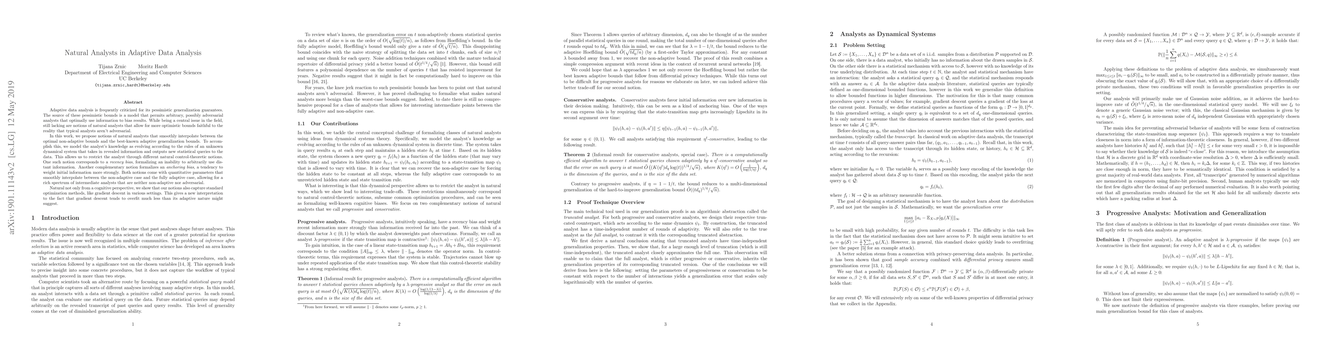 Adaptive data analysis is frequently criticized for its pessimistic generalization guarantees. The source of these pessimistic bounds is a model that permits arbitrary, possibly adversarial analysts that optimally use information to bias results. While being a central issue in the field, still lacking are notions of natural analysts that allow for more optimistic bounds faithful to the reality that typical analysts aren't adversarial. In this work, we propose notions of natural analysts that smoothly interpolate between the optimal non-adaptive bounds and the best-known adaptive generalization bounds. To accomplish this, we model the analyst's knowledge as evolving according to the rules of an unknown dynamical system that takes in revealed information and outputs new statistical queries to the data. This allows us to restrict the analyst through different natural control-theoretic notions. One such notion corresponds to a recency bias, formalizing an inability to arbitrarily use distant information. Another complementary notion formalizes an anchoring bias, a tendency to weight initial information more strongly. Both notions come with quantitative parameters that smoothly interpolate between the non-adaptive case and the fully adaptive case, allowing for a rich spectrum of intermediate analysts that are neither non-adaptive nor adversarial. Natural not only from a cognitive perspective, we show that our notions also capture standard optimization methods, like gradient descent in various settings. This gives a new interpretation to the fact that gradient descent tends to overfit much less than its adaptive nature might suggest.