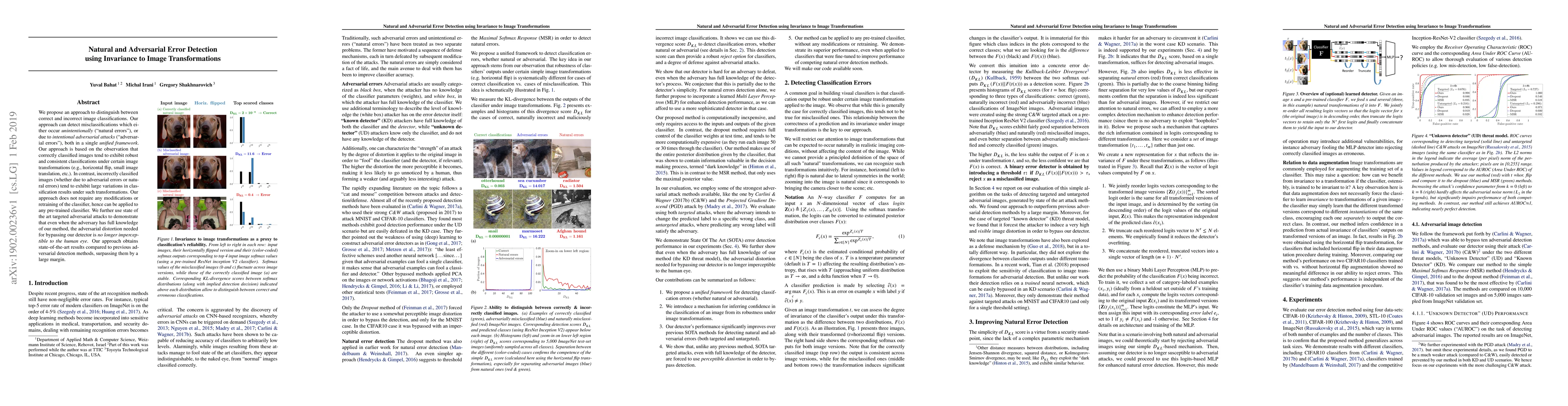 We propose an approach to distinguish between correct and incorrect image classifications. Our approach can detect misclassifications which either occur $\it{unintentionally}$ ("natural errors"), or due to $\it{intentional~adversarial~attacks}$ ("adversarial errors"), both in a single $\it{unified~framework}$. Our approach is based on the observation that correctly classified images tend to exhibit robust and consistent classifications under certain image transformations (e.g., horizontal flip, small image translation, etc.). In contrast, incorrectly classified images (whether due to adversarial errors or natural errors) tend to exhibit large variations in classification results under such transformations. Our approach does not require any modifications or retraining of the classifier, hence can be applied to any pre-trained classifier. We further use state of the art targeted adversarial attacks to demonstrate that even when the adversary has full knowledge of our method, the adversarial distortion needed for bypassing our detector is $\it{no~longer~imperceptible~to~the~human~eye}$. Our approach obtains state-of-the-art results compared to previous adversarial detection methods, surpassing them by a large margin.