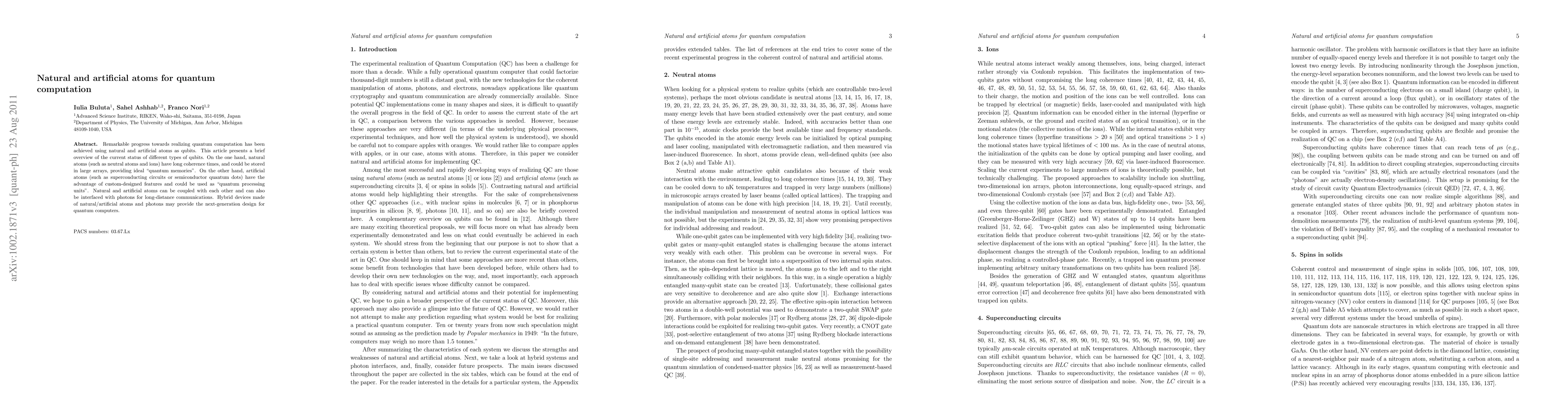 This paper reviews the current state of quantum computation using both natural atoms (like neutral atoms and ions) and artificial atoms (like superconducting circuits and quantum dots). While natural atoms offer long coherence times and potential for large-scale quantum memories, artificial atoms provide customizable features for quantum processing, and both types can be integrated for advanced quantum computing and long-distance communication.