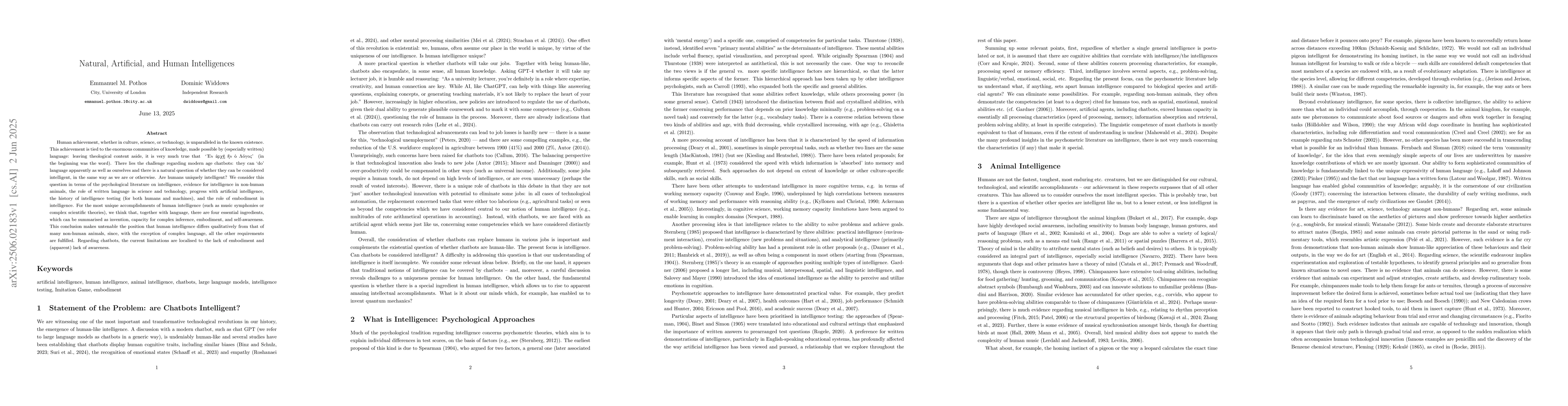 Human achievement, whether in culture, science, or technology, is unparalleled in the known existence. This achievement is tied to the enormous communities of knowledge, made possible by (especially written) language: leaving theological content aside, it is very much true that "in the beginning was the word". There lies the challenge regarding modern age chatbots: they can 'do' language apparently as well as ourselves and there is a natural question of whether they can be considered intelligent, in the same way as we are or otherwise. Are humans uniquely intelligent? We consider this question in terms of the psychological literature on intelligence, evidence for intelligence in non-human animals, the role of written language in science and technology, progress with artificial intelligence, the history of intelligence testing (for both humans and machines), and the role of embodiment in intelligence. For the most unique accomplishments of human intelligence (such as music symphonies or complex scientific theories), we think that, together with language, there are four essential ingredients, which can be summarised as invention, capacity for complex inference, embodiment, and self-awareness. This conclusion makes untenable the position that human intelligence differs qualitatively from that of many non-human animals, since, with the exception of complex language, all the other requirements are fulfilled. Regarding chatbots, the current limitations are localised to the lack of embodiment and (apparent) lack of awareness.