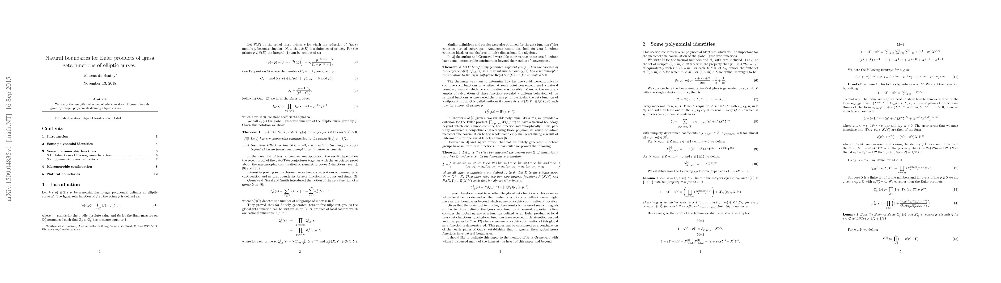 Summary: This paper investigates the analytic continuation of adelic Igusa zeta functions associated with elliptic curves, demonstrating their meromorphic continuation up to a natural boundary beyond which no further continuation is possible, leveraging results from symmetric power L-functions and the Sato-Tate conjectures.