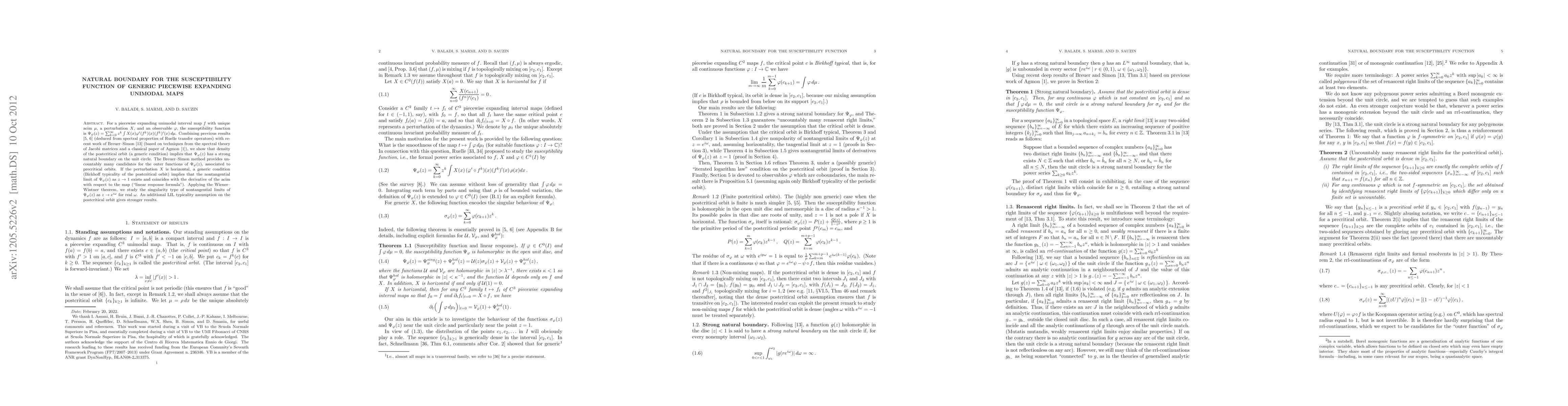 This paper investigates the susceptibility function Ψ(z) of piecewise expanding unimodal maps, showing that its natural boundary lies on the unit circle under density of the postcritical orbit. It also demonstrates that horizontal perturbations lead to the existence of nontangential limits coinciding with the derivative of the acim, applying the Wiener-Wintner theorem to study their singularity types.