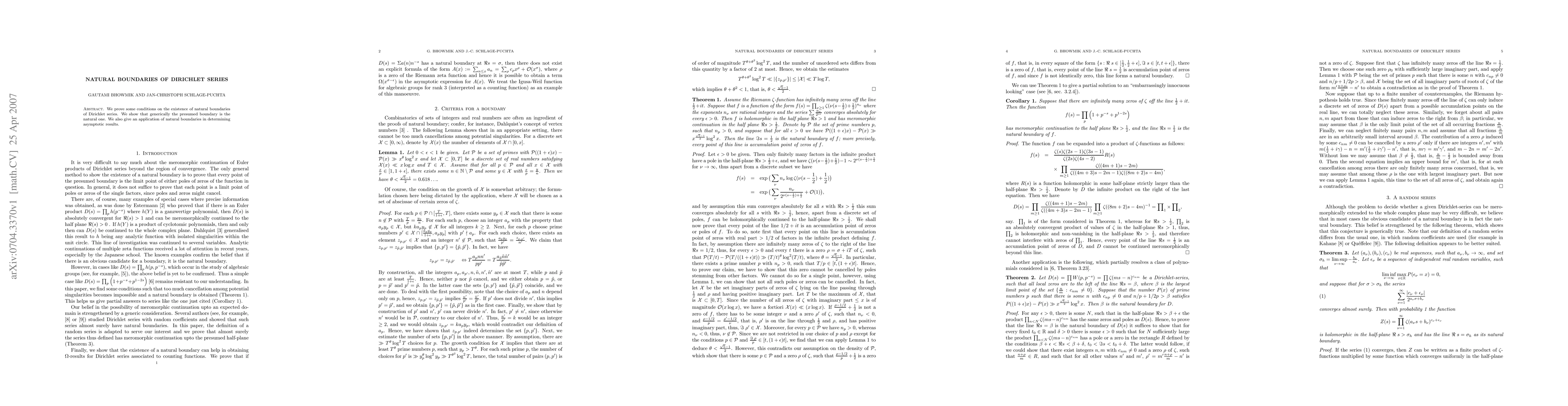 This paper proves conditions for the existence of natural boundaries of Dirichlet series, demonstrating that such boundaries typically occur as presumed boundaries. It also applies natural boundaries to derive asymptotic results.