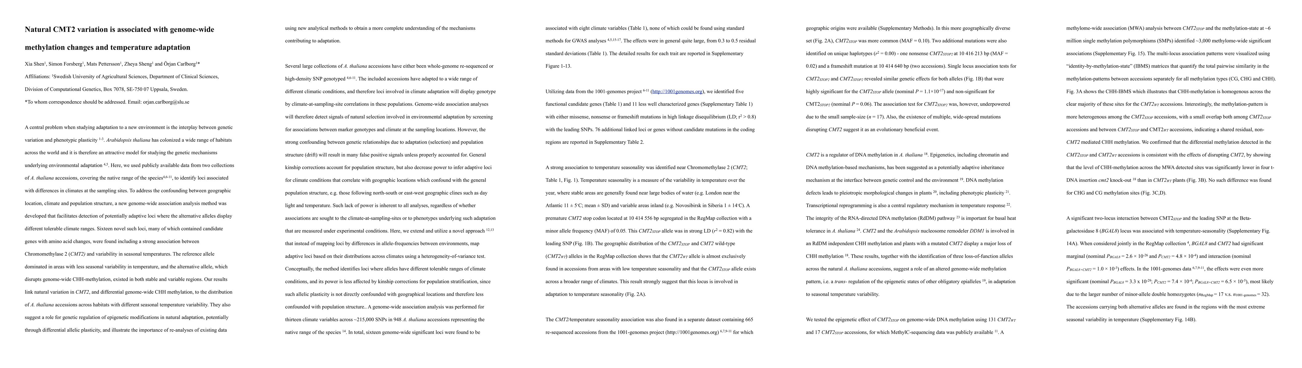 This study identifies loci in Arabidopsis thaliana associated with climate adaptation, revealing a significant link between natural variation in Chromomethylase 2 (CMT2) and genome-wide methylation changes, particularly in response to seasonal temperature variability. The findings suggest that genetic regulation of epigenetic modifications plays a role in environmental adaptation.