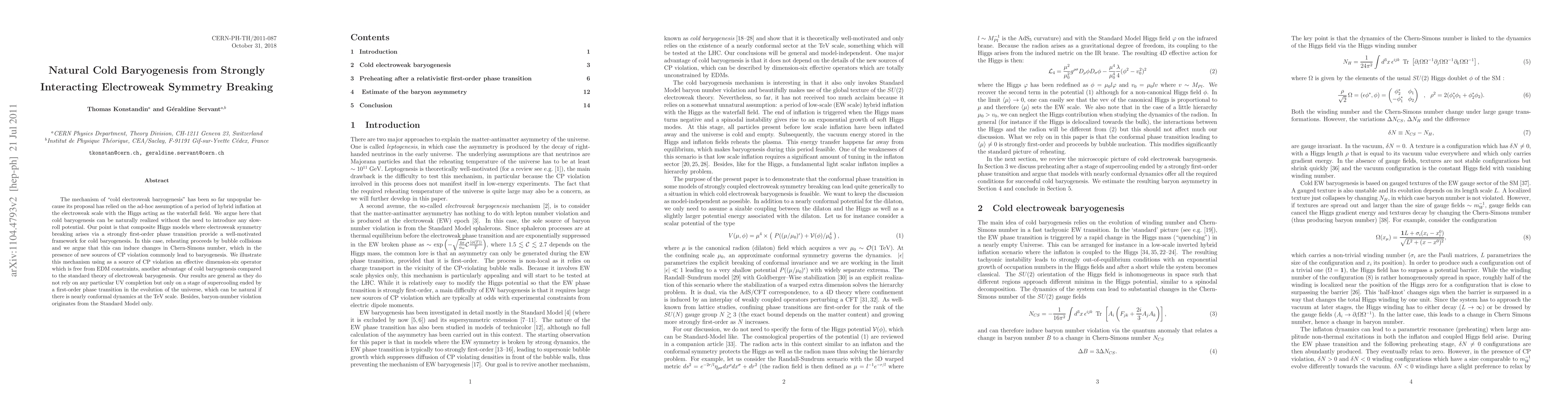 This paper proposes a natural cold baryogenesis mechanism without hybrid inflation, relying on strongly interacting electroweak symmetry breaking via a first-order phase transition. It argues that bubble collisions during reheating can induce changes in Chern-Simons number, leading to baryogenesis, facilitated by a CP-violating effective operator free from EDM constraints.