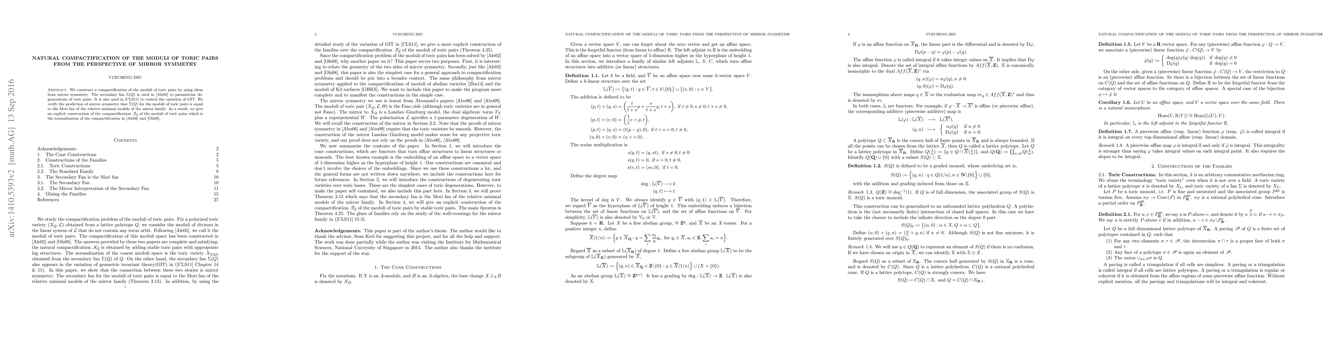 This paper constructs a compactification of the moduli of toric pairs using mirror symmetry, verifying that the secondary fan $\Sigma(Q)$ corresponds to the Mori fan of the mirror family. The resulting compactification $\mathscr{T}_Q$ is the normalization of prior compactifications.