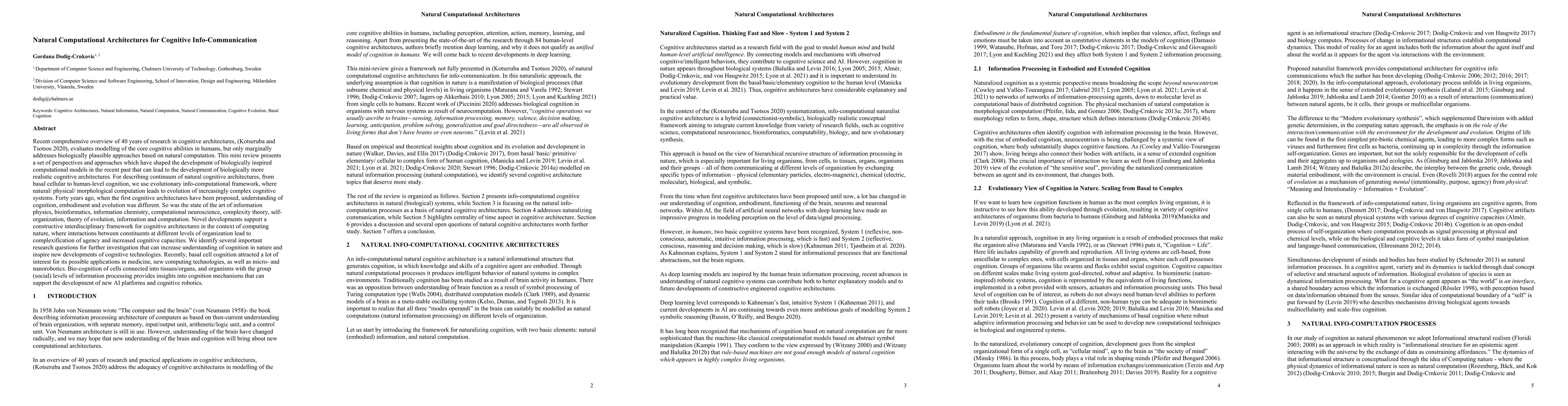 Recent comprehensive overview of 40 years of research in cognitive architectures, (Kotseruba and Tsotsos 2020), evaluates modelling of the core cognitive abilities in humans, but only marginally addresses biologically plausible approaches based on natural computation. This mini review presents a set of perspectives and approaches which have shaped the development of biologically inspired computational models in the recent past that can lead to the development of biologically more realistic cognitive architectures. For describing continuum of natural cognitive architectures, from basal cellular to human-level cognition, we use evolutionary info-computational framework, where natural/ physical/ morphological computation leads to evolution of increasingly complex cognitive systems. Forty years ago, when the first cognitive architectures have been proposed, understanding of cognition, embodiment and evolution was different. So was the state of the art of information physics, bioinformatics, information chemistry, computational neuroscience, complexity theory, self-organization, theory of evolution, information and computation. Novel developments support a constructive interdisciplinary framework for cognitive architectures in the context of computing nature, where interactions between constituents at different levels of organization lead to complexification of agency and increased cognitive capacities. We identify several important research questions for further investigation that can increase understanding of cognition in nature and inspire new developments of cognitive technologies. Recently, basal cell cognition attracted a lot of interest for its possible applications in medicine, new computing technologies, as well as micro- and nanorobotics.