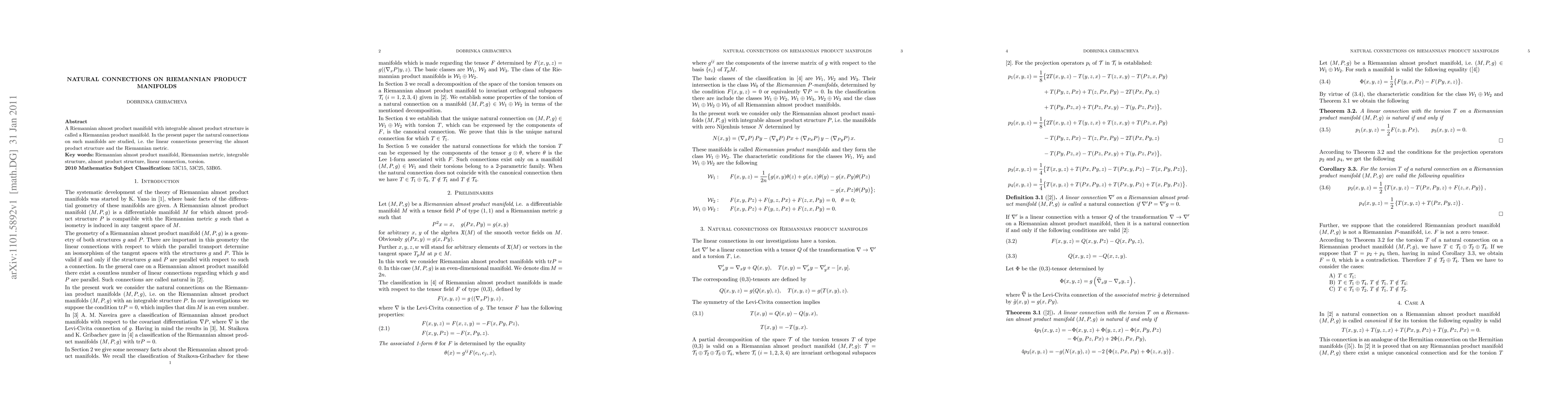 Summary: This paper investigates the natural connections on Riemannian product manifolds, focusing on linear connections that maintain both the integrable almost product structure and the Riemannian metric. The study aims to understand the properties and implications of such connections in differential geometry.