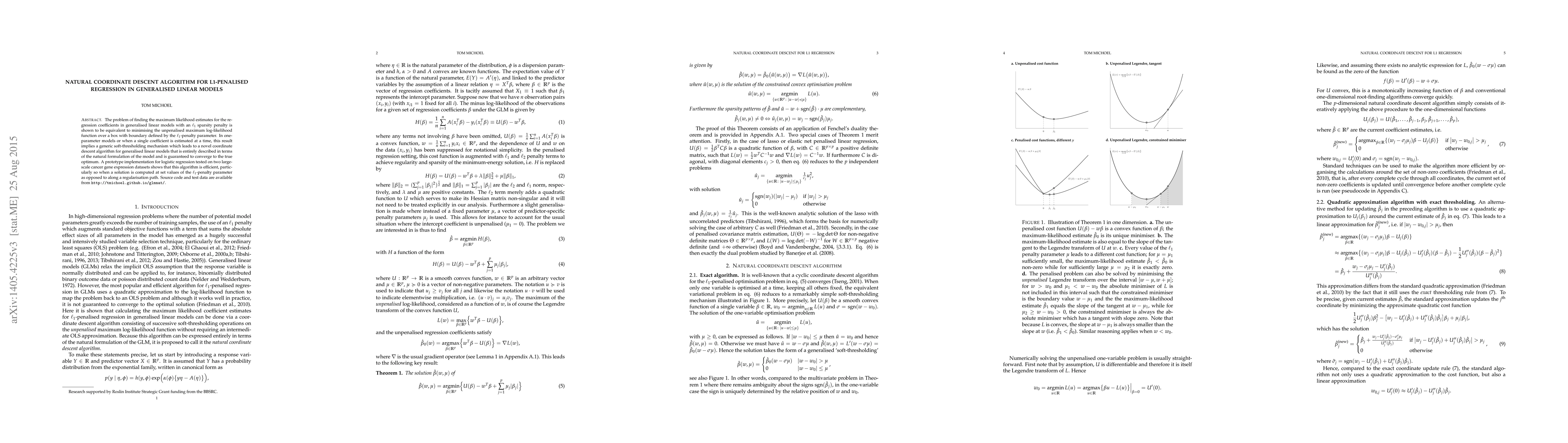 This paper proposes a natural coordinate descent algorithm for L1-penalised regression in generalised linear models, demonstrating its convergence to the true optimum and efficiency, especially for fixed L1-penalty values. The algorithm was tested on large-scale cancer gene expression datasets, showing its practical effectiveness.