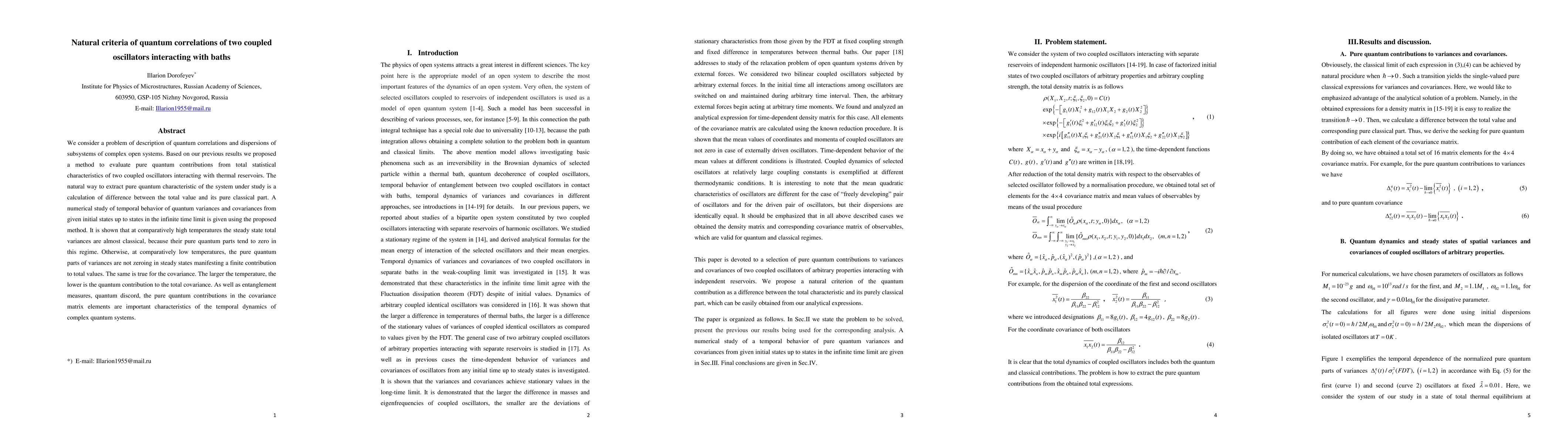 This paper proposes a method to evaluate pure quantum contributions to the statistical characteristics of two coupled oscillators interacting with thermal reservoirs. It finds that at high temperatures, quantum variances and covariances tend to classical values, while at low temperatures, they maintain significant quantum contributions.