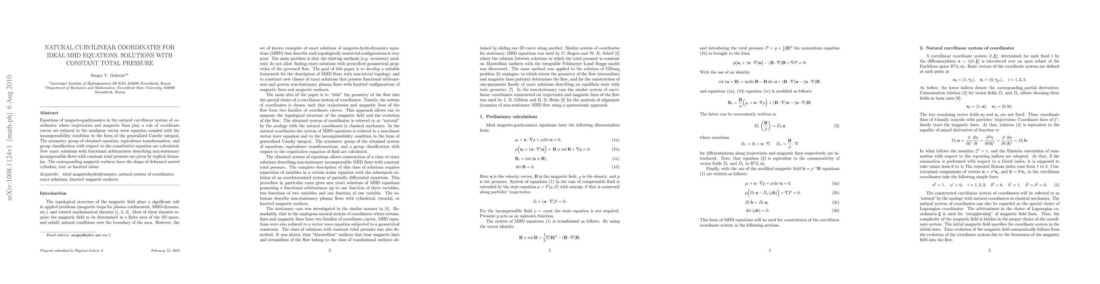 This paper explores the magneto-gasdynamics equations in natural curvilinear coordinates, deriving a nonlinear vector wave equation and a generalized Cauchy integral. It presents new exact solutions describing non-stationary incompressible flows with constant total pressure, featuring magnetic surfaces shaped as deformed cylinders, tori, or knotted tubes.