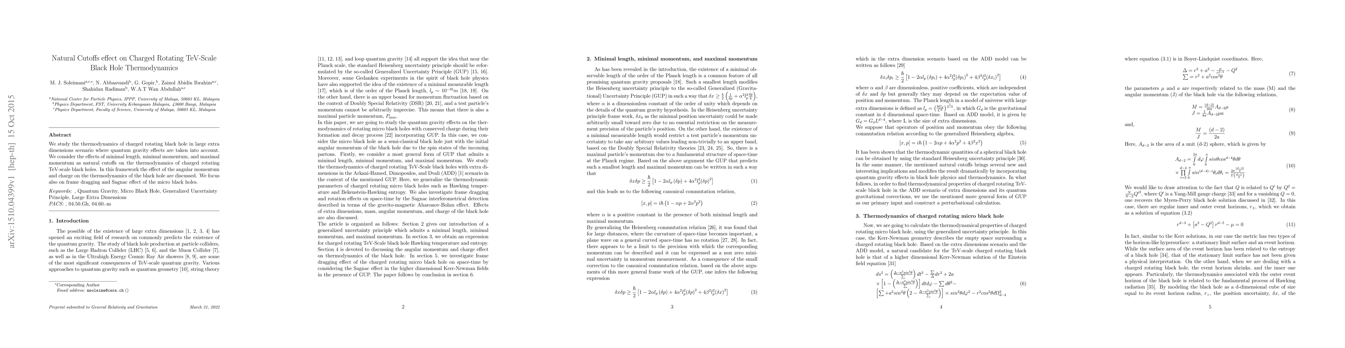 This paper investigates the thermodynamics of charged rotating TeV-scale black holes in the context of large extra dimensions, considering quantum gravity effects through natural cutoffs. It examines how minimal length, minimal momentum, and maximal momentum influence the thermodynamics, including angular momentum, charge, frame dragging, and the Sagnac effect.