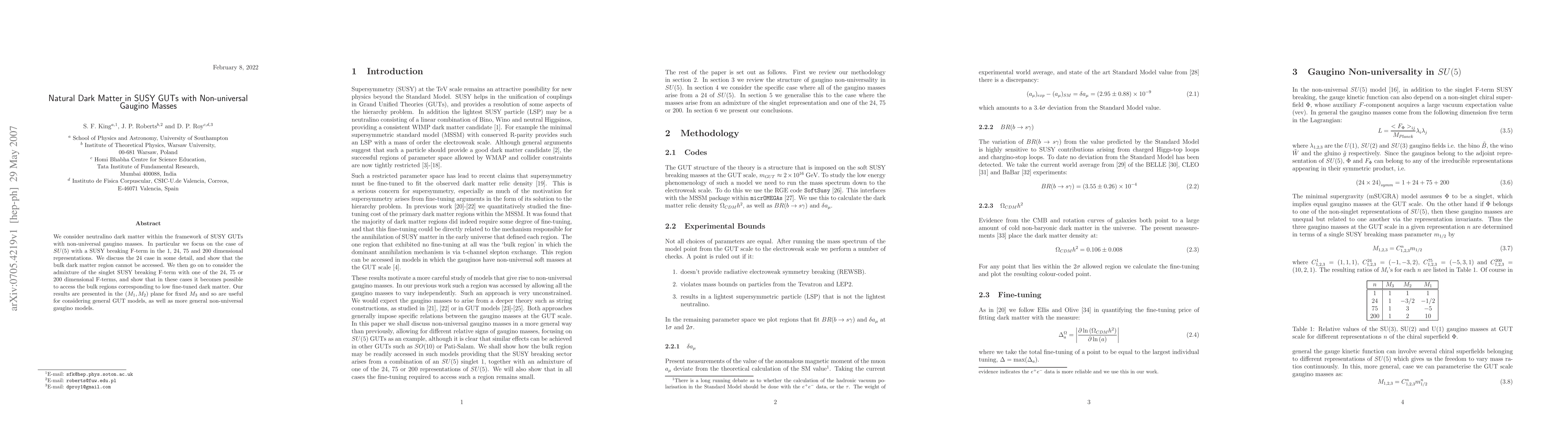 This paper examines neutralino dark matter in SUSY GUTs with non-universal gaugino masses, focusing on SU(5) models. It finds that the pure 24-dimensional SUSY breaking scenario cannot yield the desired dark matter properties, but mixing this with other F-terms allows for access to regions with low fine-tuned dark matter, presented in $(M_1,M_2)$ plane for a fixed $M_3$.