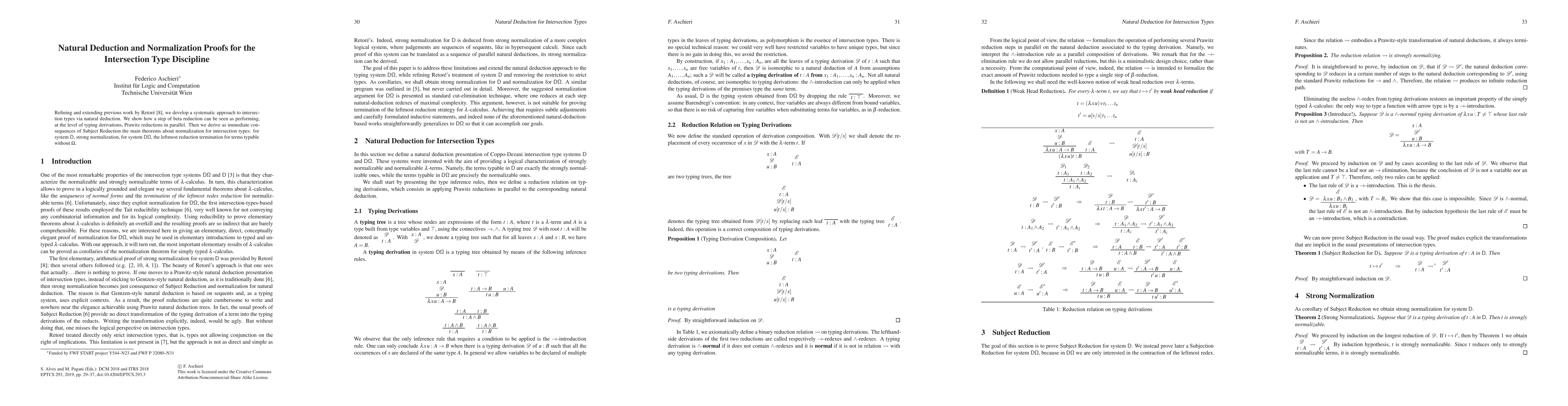 This paper refines intersection type theory using natural deduction, demonstrating that beta reduction corresponds to Prawitz reductions in typing derivations. It establishes normalization theorems for system D and Omega, proving strong normalization and leftmost reduction termination for typable terms.