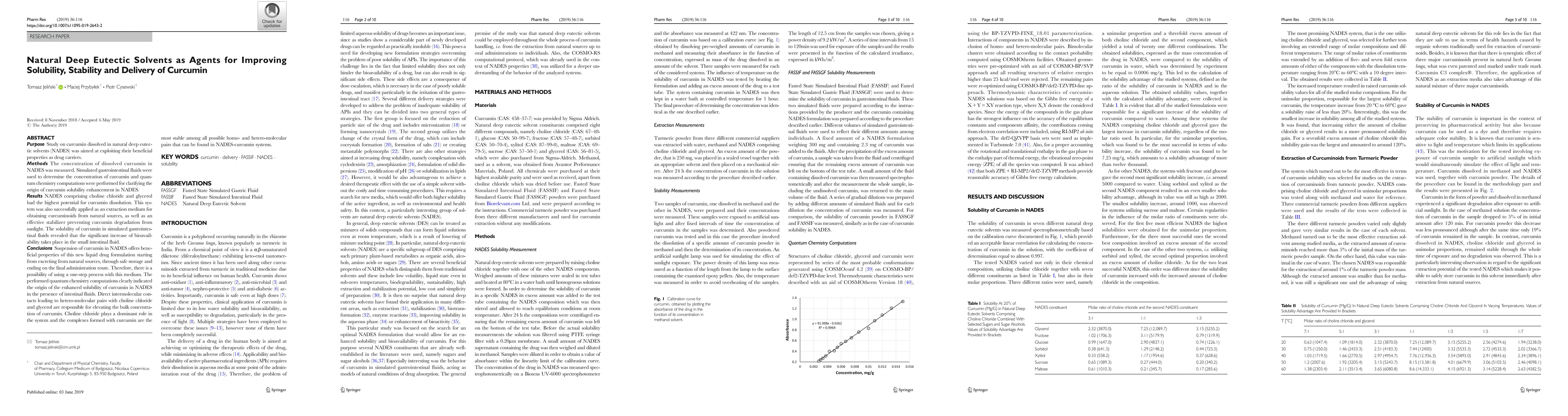 Purpose Study on curcumin dissolved in natural deep eutectic solvents (NADES) was aimed at exploiting their beneficial properties as drug carriers. Methods The concentration of dissolved curcumin in NADES was measured. Simulated gastrointestinal fluids were used to determine the concentration of curcumin and quantum chemistry computations were performed for clarifying the origin of curcumin solubility enhancement in NADES. Results NADES comprising choline chloride and glycerol had the highest potential for curcumin dissolution. This system was also successfully applied as an extraction medium for obtaining curcuminoids from natural sources, as well as an effective stabilizer preventing curcumin degradation from sunlight. The solubility of curcumin in simulated gastrointestinal fluids revealed that the significant increase of bioavailability takes place in the small intestinal fluid. Conclusions Suspension of curcumin in NADES offers beneficial properties of this new liquid drug formulation starting from excreting from natural sources, through safe storage and ending on the final administration route. Therefore, there is a possibility of using a one-step process with this medium. The performed quantum chemistry computations clearly indicated the origin of the enhanced solubility of curcumin in NADES in the presence of intestinal fluids. Direct intermolecular contacts leading to hetero-molecular pairs with choline chloride and glycerol are responsible for elevating the bulk concentration of curcumin. Choline chloride plays a dominant role in the system and the complexes formed with curcumin are the most stable among all possible homo- and hetero-molecular pairs that can be found in NADES-curcumin systems.