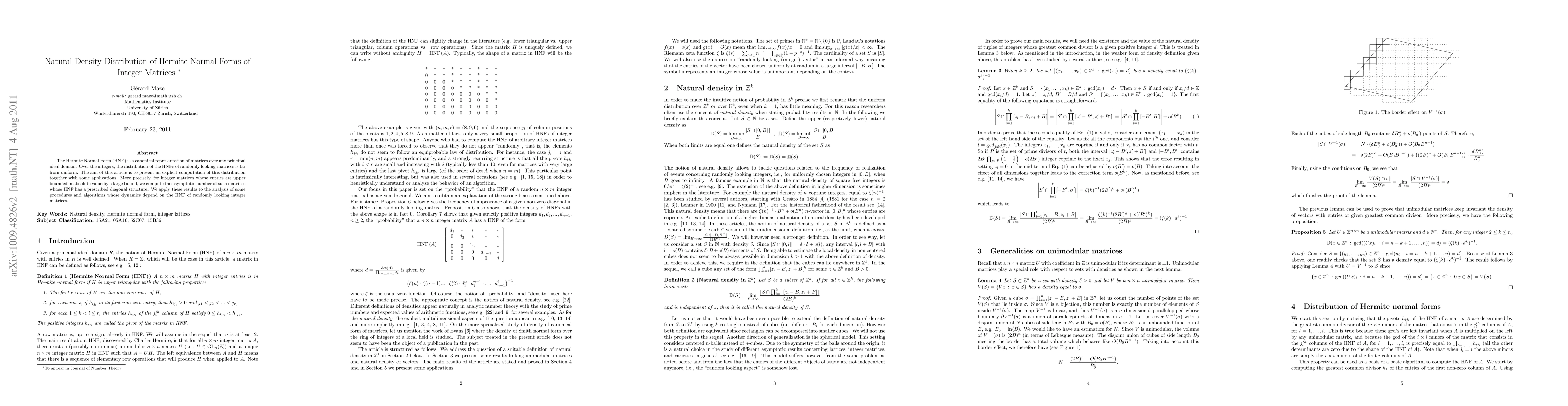 This paper computes the natural density distribution of Hermite Normal Forms (HNF) for integer matrices with bounded entries, revealing non-uniform distribution patterns. It provides applications to algorithms whose performance is influenced by the HNF of randomly generated integer matrices.